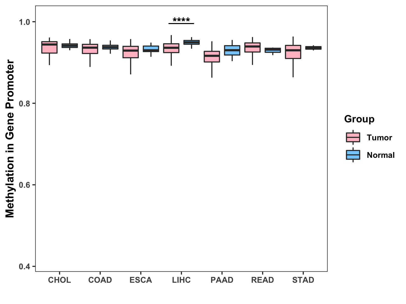 Boxplot of All Gastrointestinal Cancer ( * : 0.01-0.05 , ** : 0.005-0.01 , *** : 0.0001-0.005 , **** : < 0.0001 ) |