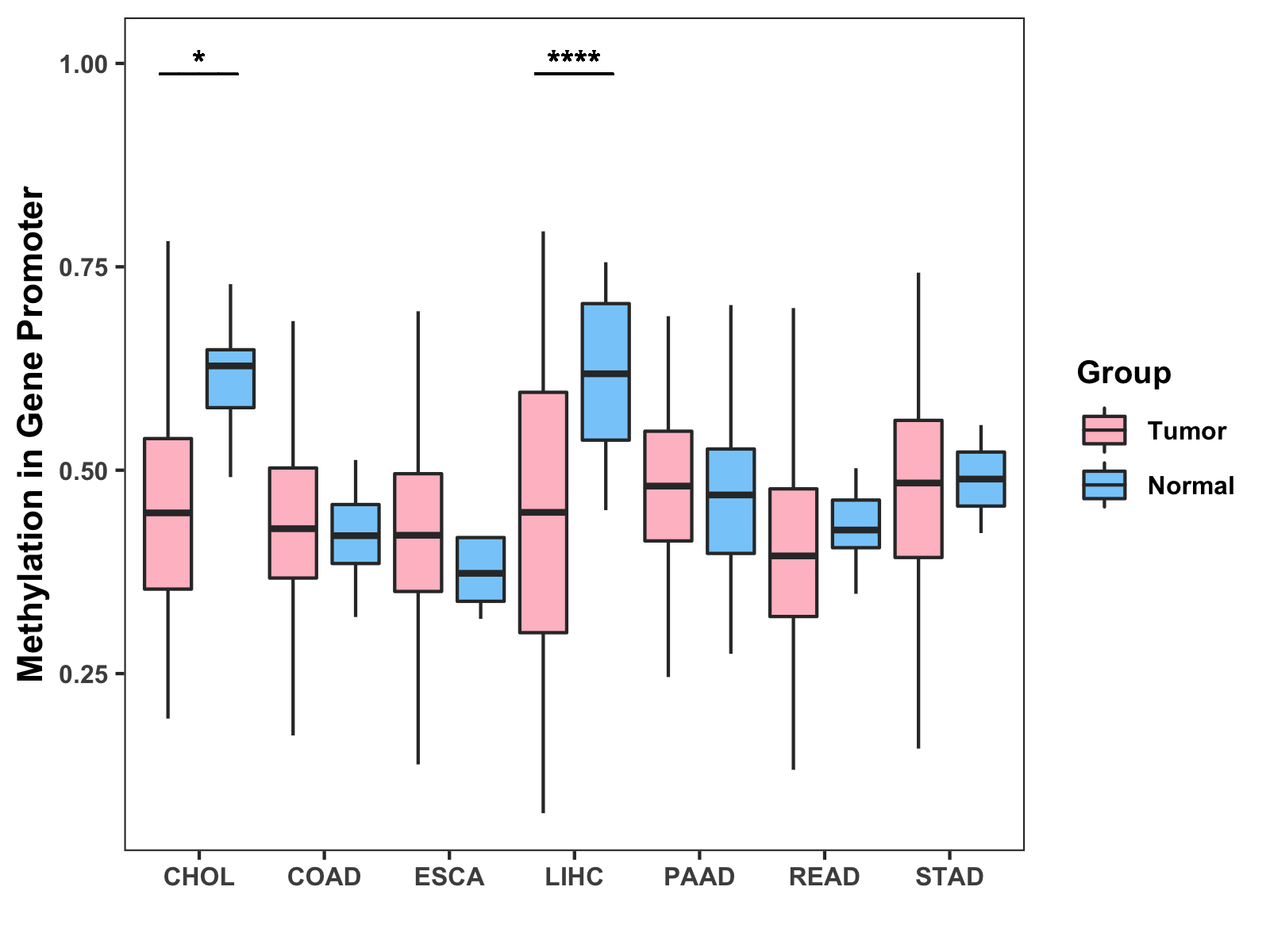 Boxplot of All Gastrointestinal Cancer ( * : 0.01-0.05 , ** : 0.005-0.01 , *** : 0.0001-0.005 , **** : < 0.0001 ) |