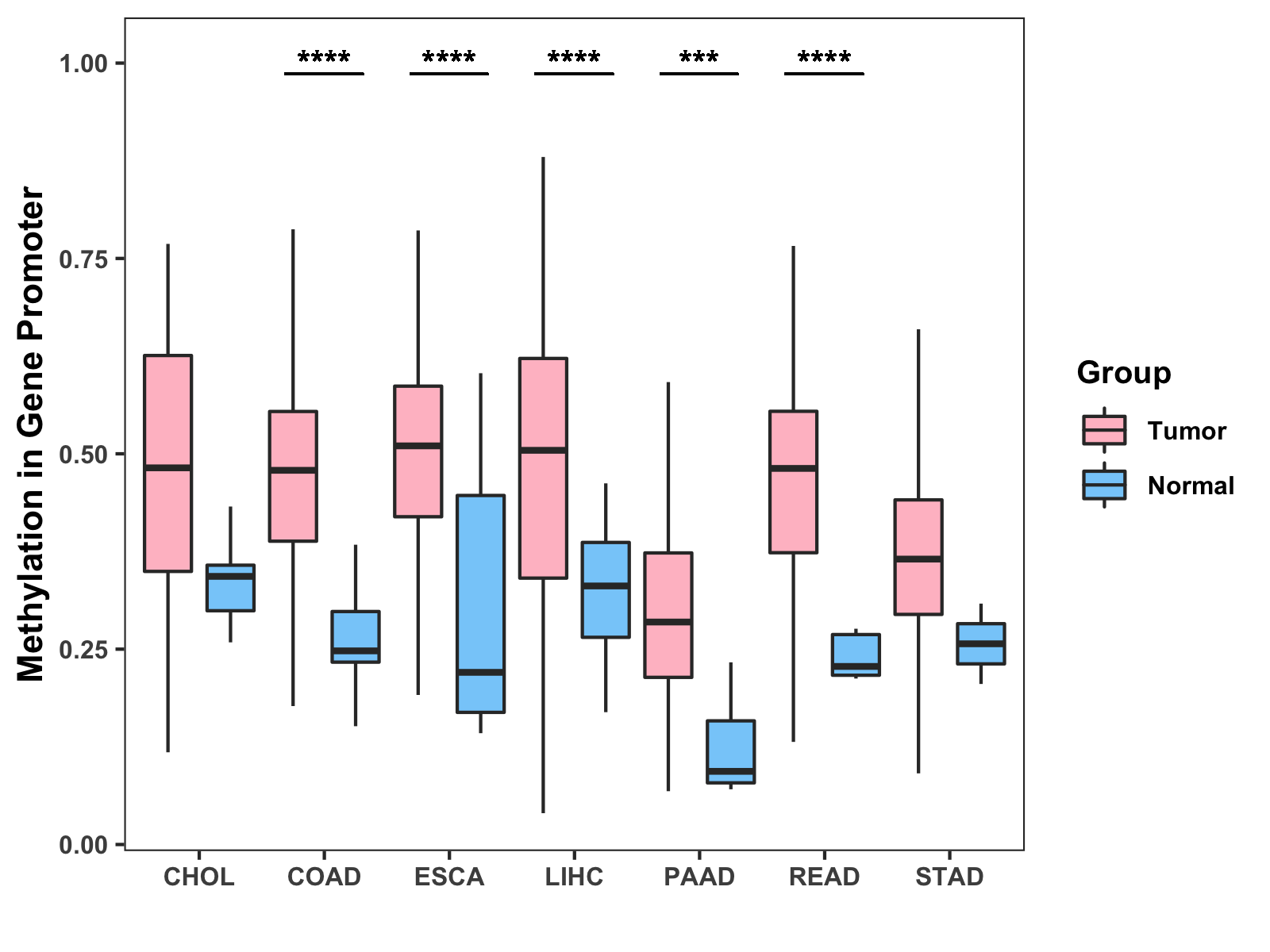Boxplot of All Gastrointestinal Cancer ( * : 0.01-0.05 , ** : 0.005-0.01 , *** : 0.0001-0.005 , **** : < 0.0001 ) |