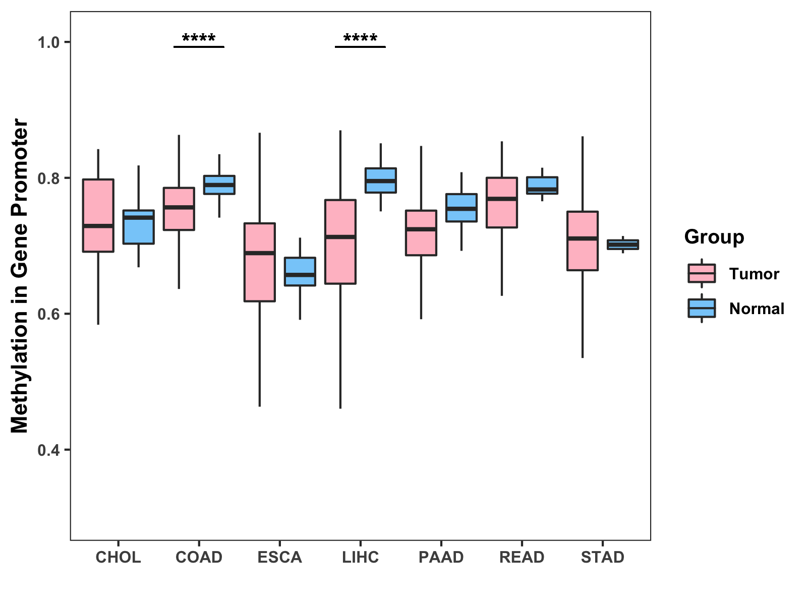 Boxplot of All Gastrointestinal Cancer ( * : 0.01-0.05 , ** : 0.005-0.01 , *** : 0.0001-0.005 , **** : < 0.0001 ) |