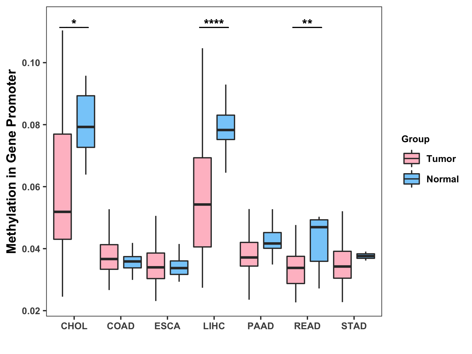 Boxplot of All Gastrointestinal Cancer ( * : 0.01-0.05 , ** : 0.005-0.01 , *** : 0.0001-0.005 , **** : < 0.0001 ) |