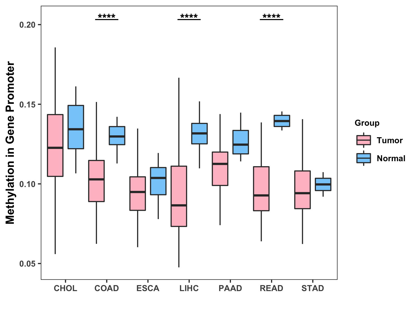 Boxplot of All Gastrointestinal Cancer ( * : 0.01-0.05 , ** : 0.005-0.01 , *** : 0.0001-0.005 , **** : < 0.0001 ) |