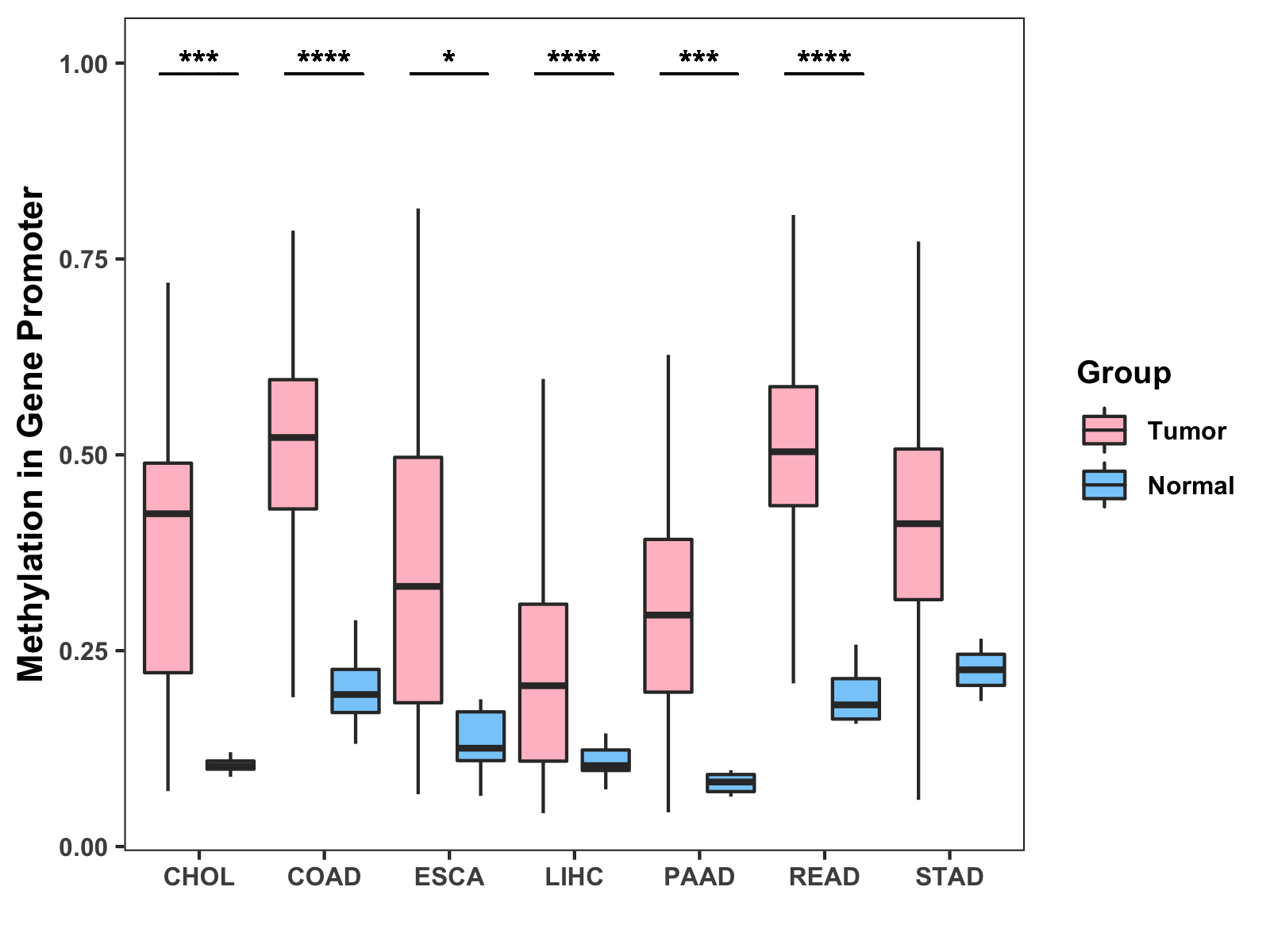 Boxplot of All Gastrointestinal Cancer ( * : 0.01-0.05 , ** : 0.005-0.01 , *** : 0.0001-0.005 , **** : < 0.0001 ) |