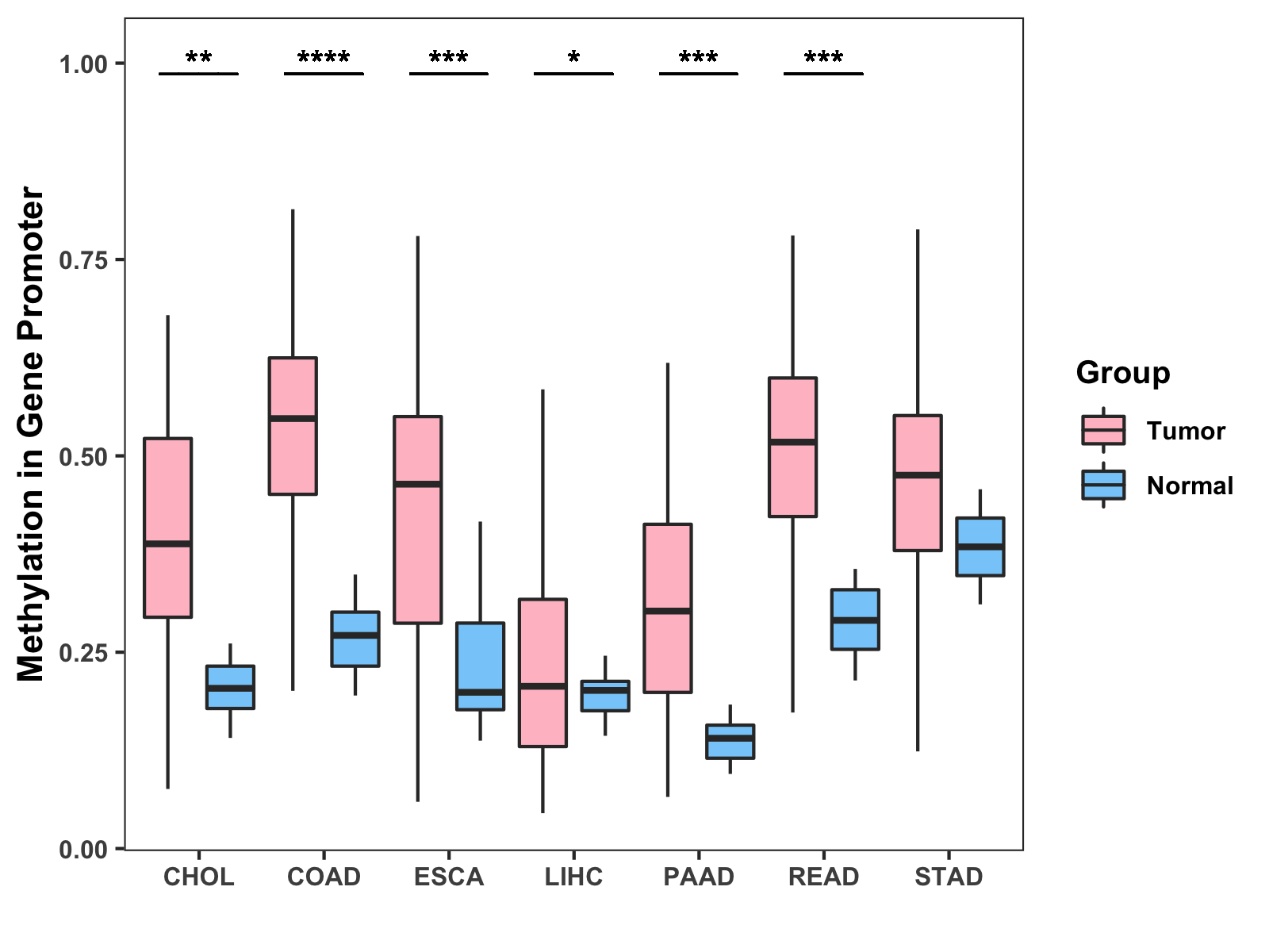 Boxplot of All Gastrointestinal Cancer ( * : 0.01-0.05 , ** : 0.005-0.01 , *** : 0.0001-0.005 , **** : < 0.0001 ) |