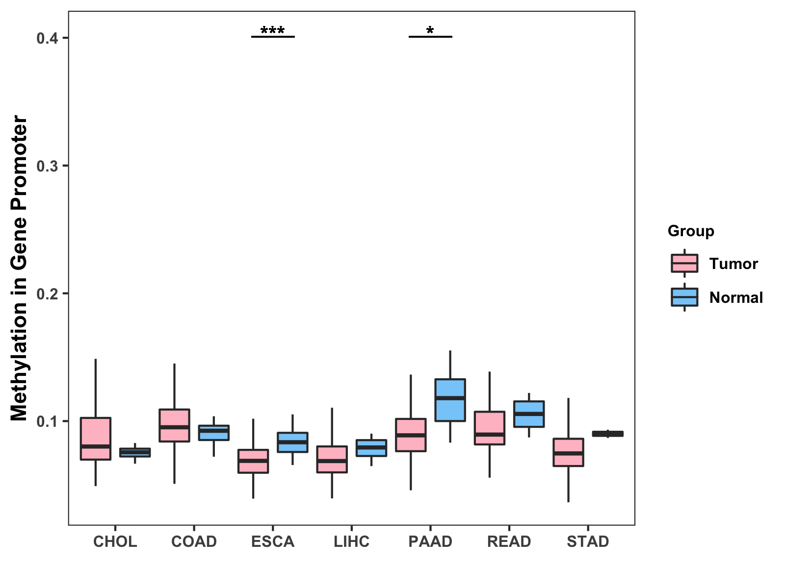 Boxplot of All Gastrointestinal Cancer ( * : 0.01-0.05 , ** : 0.005-0.01 , *** : 0.0001-0.005 , **** : < 0.0001 ) |