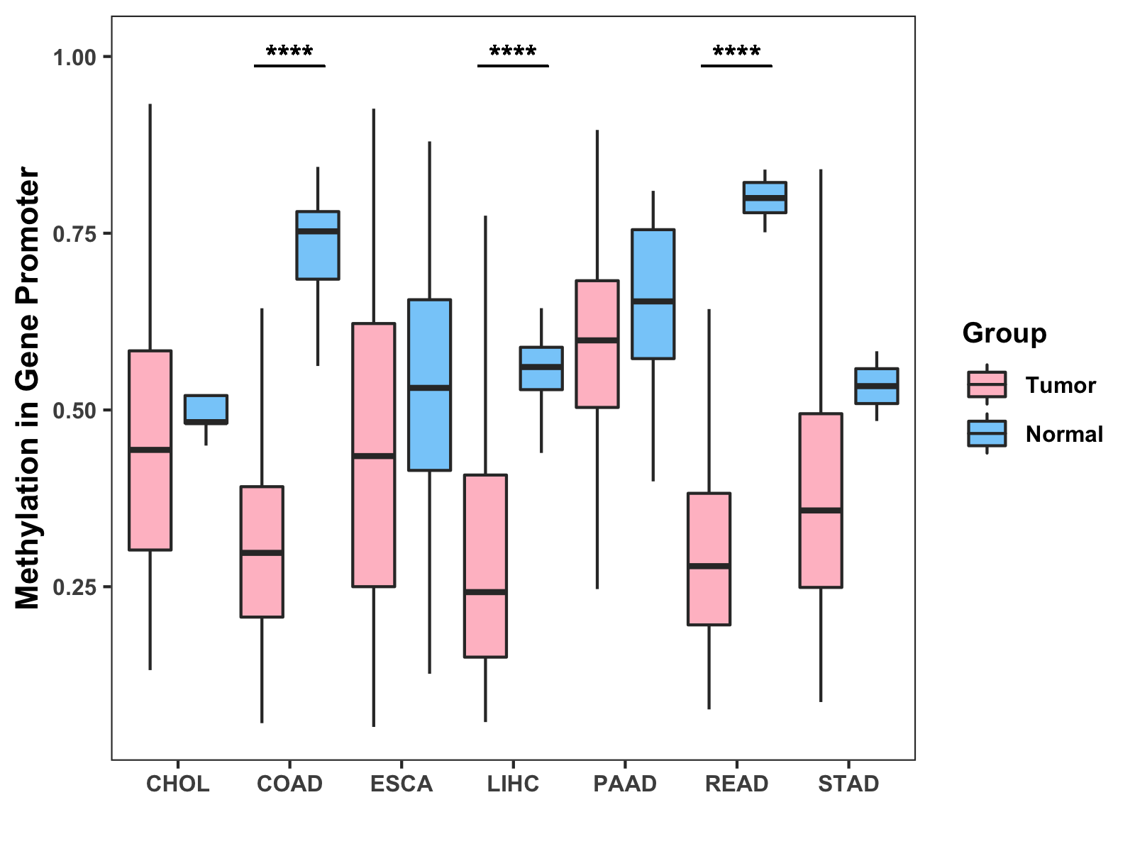 Boxplot of All Gastrointestinal Cancer ( * : 0.01-0.05 , ** : 0.005-0.01 , *** : 0.0001-0.005 , **** : < 0.0001 ) |