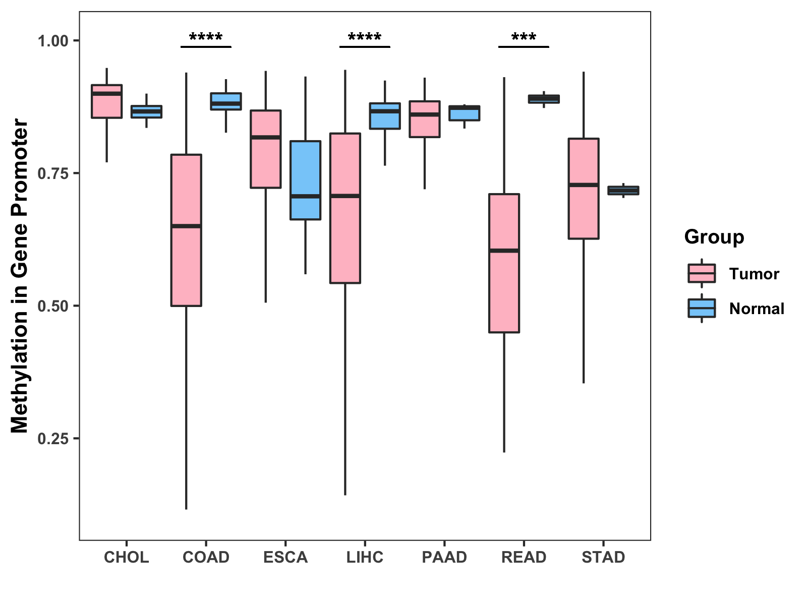 Boxplot of All Gastrointestinal Cancer ( * : 0.01-0.05 , ** : 0.005-0.01 , *** : 0.0001-0.005 , **** : < 0.0001 ) |
