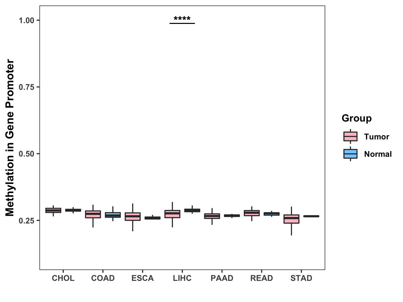 Boxplot of All Gastrointestinal Cancer ( * : 0.01-0.05 , ** : 0.005-0.01 , *** : 0.0001-0.005 , **** : < 0.0001 ) |