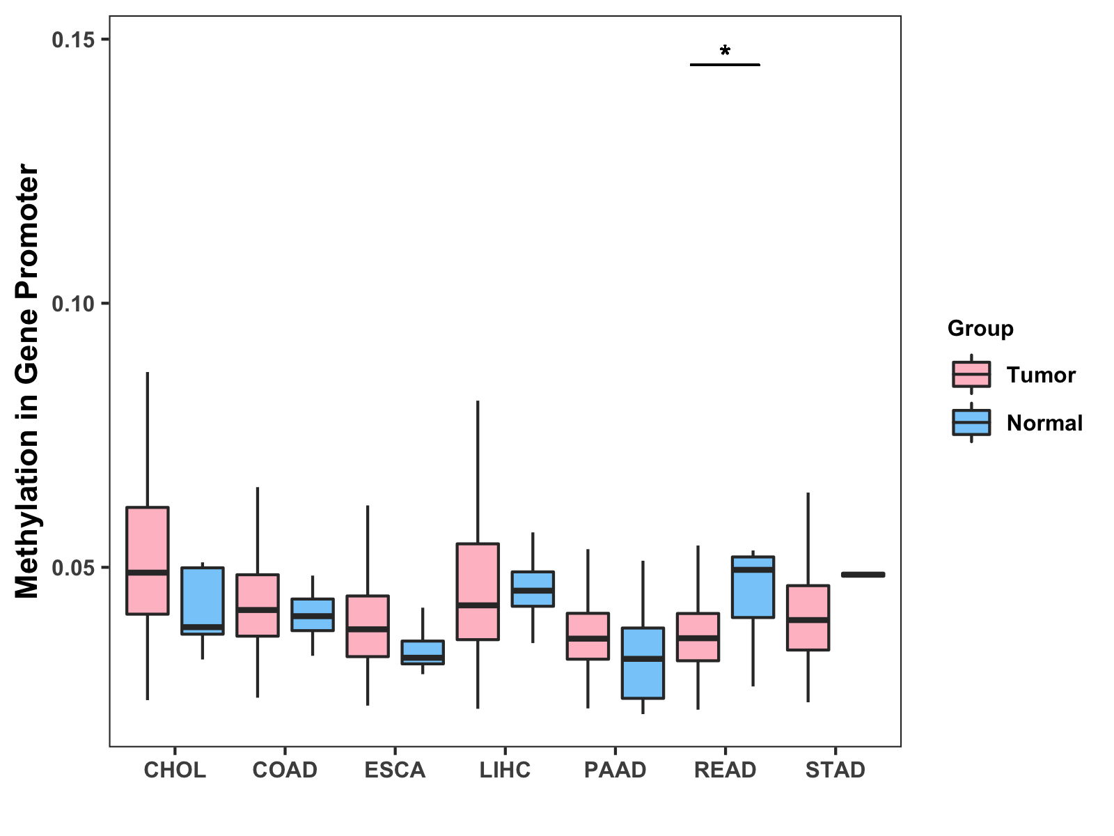 Boxplot of All Gastrointestinal Cancer ( * : 0.01-0.05 , ** : 0.005-0.01 , *** : 0.0001-0.005 , **** : < 0.0001 ) |