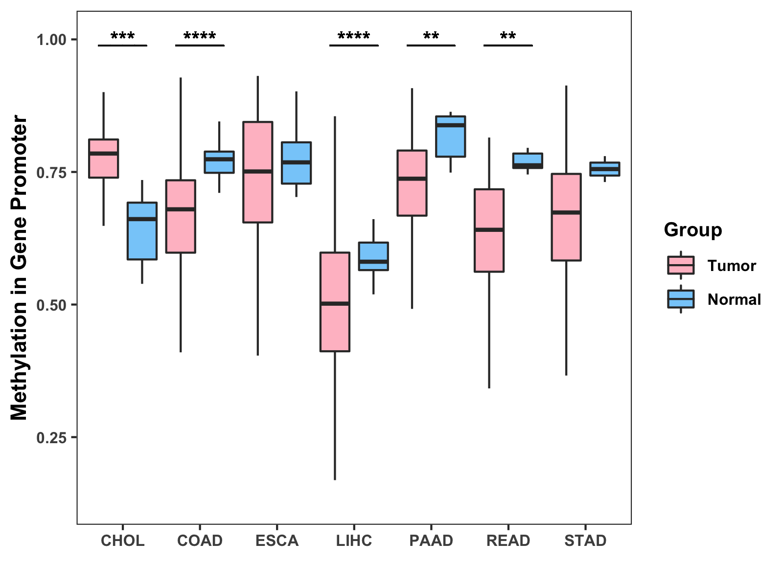 Boxplot of All Gastrointestinal Cancer ( * : 0.01-0.05 , ** : 0.005-0.01 , *** : 0.0001-0.005 , **** : < 0.0001 ) |