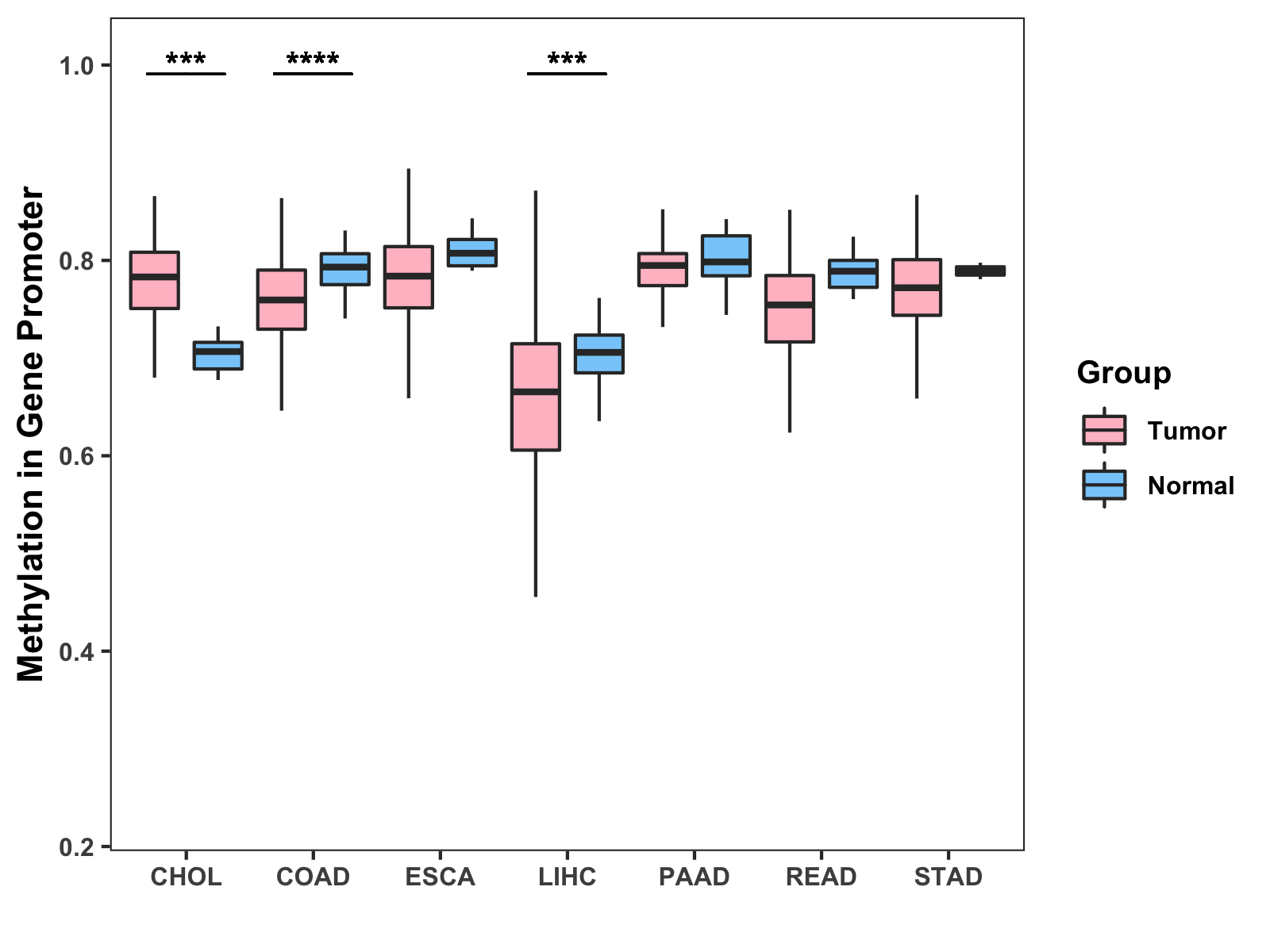 Boxplot of All Gastrointestinal Cancer ( * : 0.01-0.05 , ** : 0.005-0.01 , *** : 0.0001-0.005 , **** : < 0.0001 ) |
