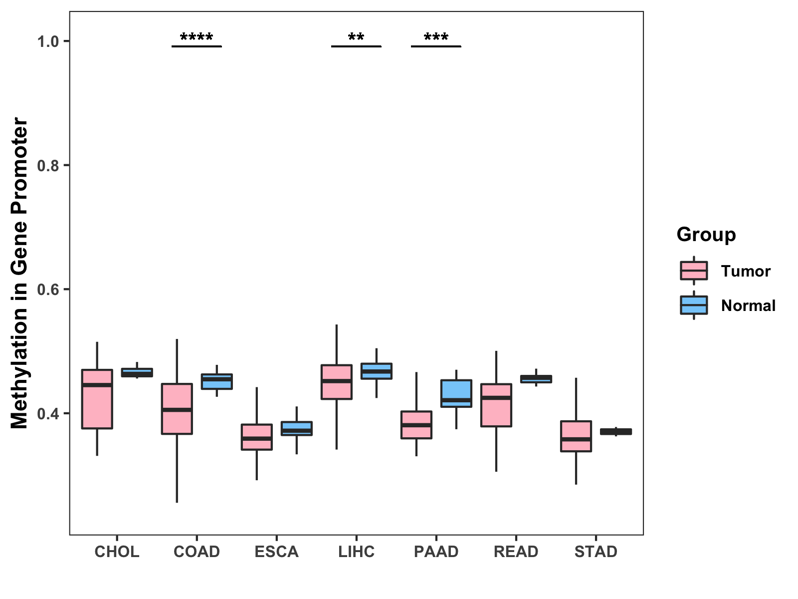 Boxplot of All Gastrointestinal Cancer ( * : 0.01-0.05 , ** : 0.005-0.01 , *** : 0.0001-0.005 , **** : < 0.0001 ) |
