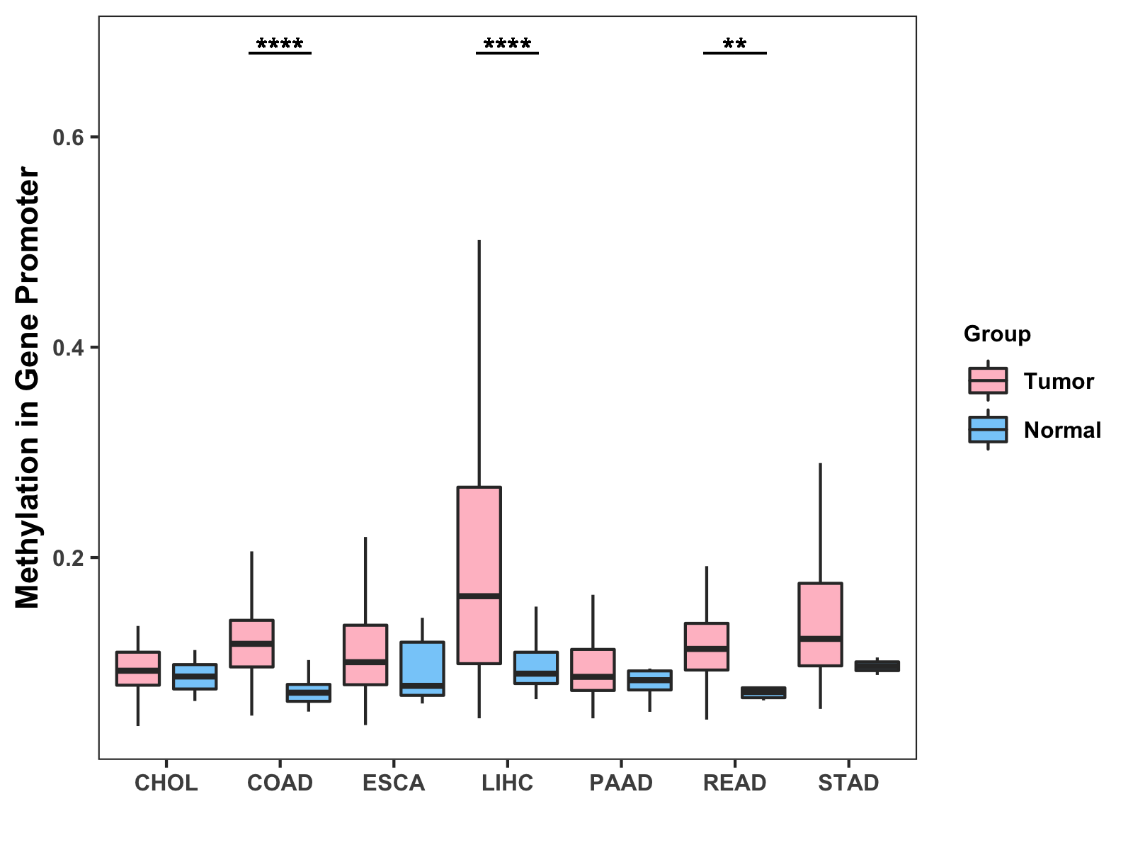 Boxplot of All Gastrointestinal Cancer ( * : 0.01-0.05 , ** : 0.005-0.01 , *** : 0.0001-0.005 , **** : < 0.0001 ) |