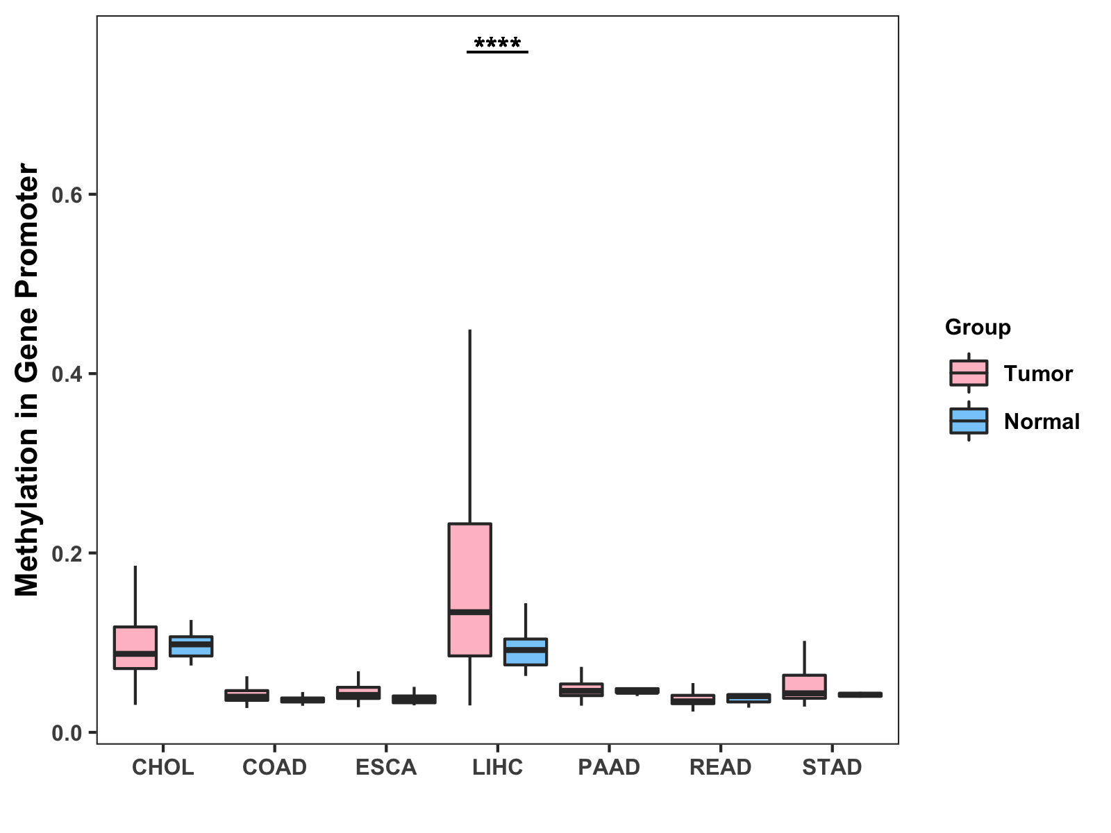 Boxplot of All Gastrointestinal Cancer ( * : 0.01-0.05 , ** : 0.005-0.01 , *** : 0.0001-0.005 , **** : < 0.0001 ) |