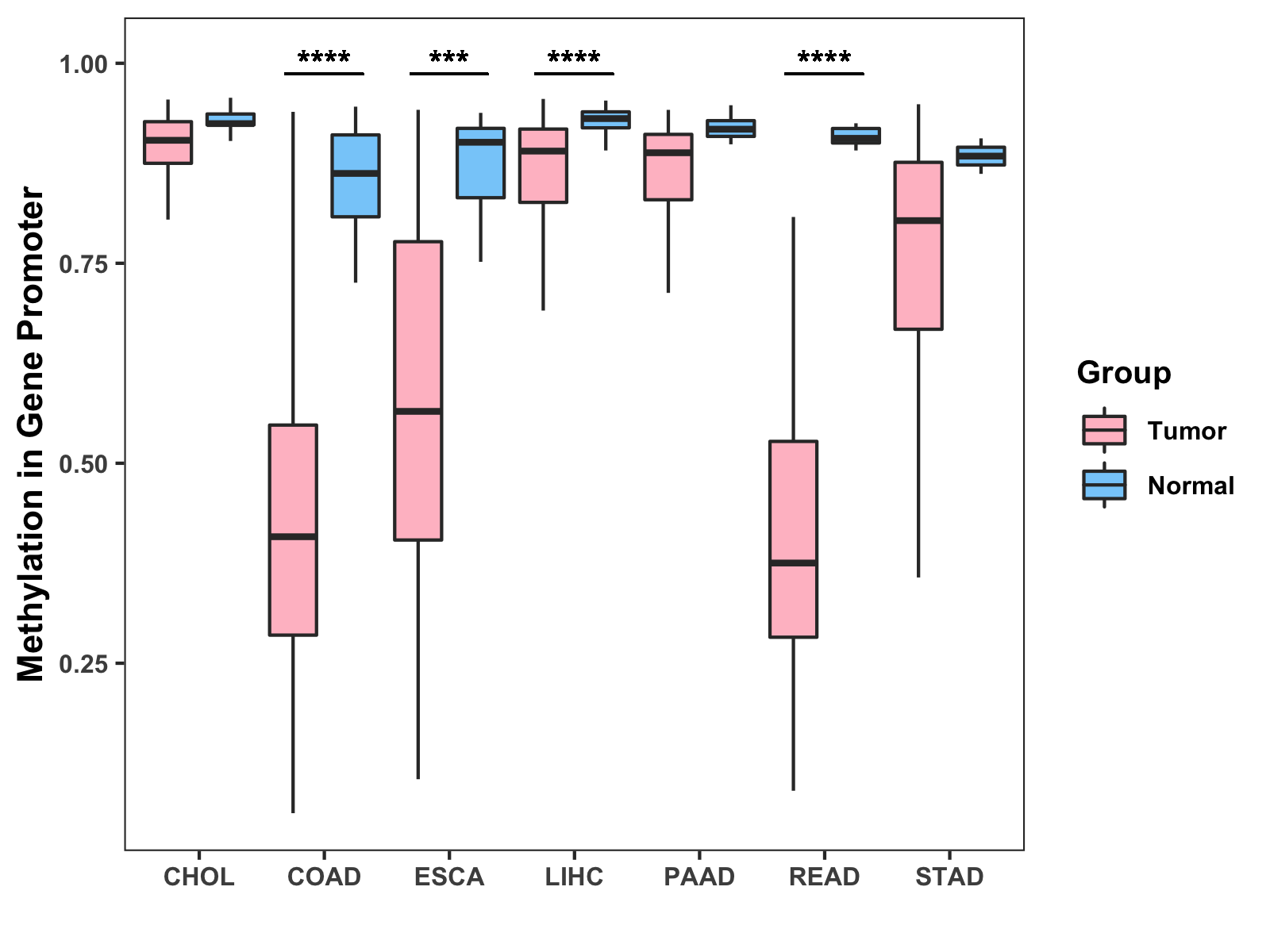 Boxplot of All Gastrointestinal Cancer ( * : 0.01-0.05 , ** : 0.005-0.01 , *** : 0.0001-0.005 , **** : < 0.0001 ) |