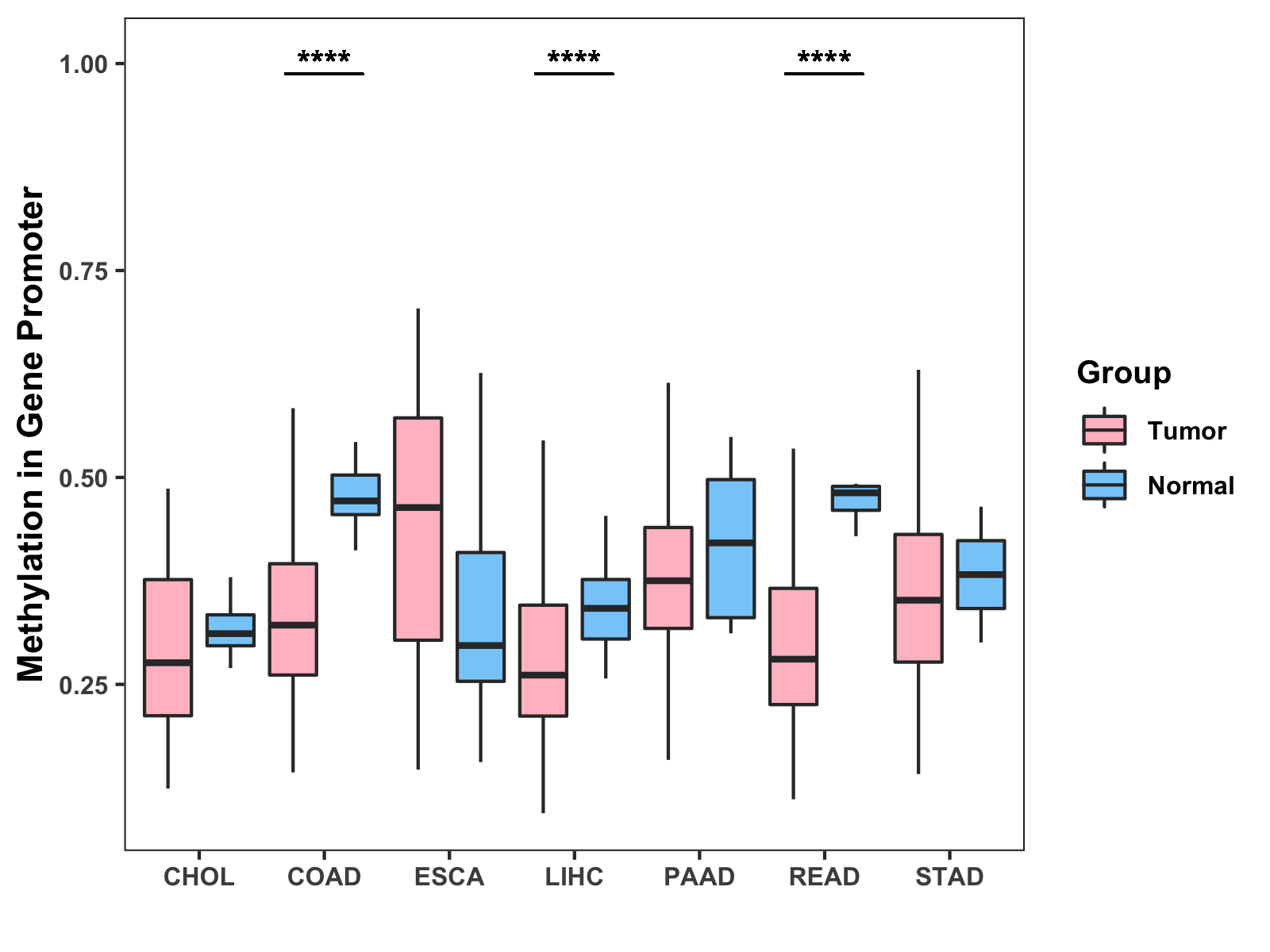 Boxplot of All Gastrointestinal Cancer ( * : 0.01-0.05 , ** : 0.005-0.01 , *** : 0.0001-0.005 , **** : < 0.0001 ) |