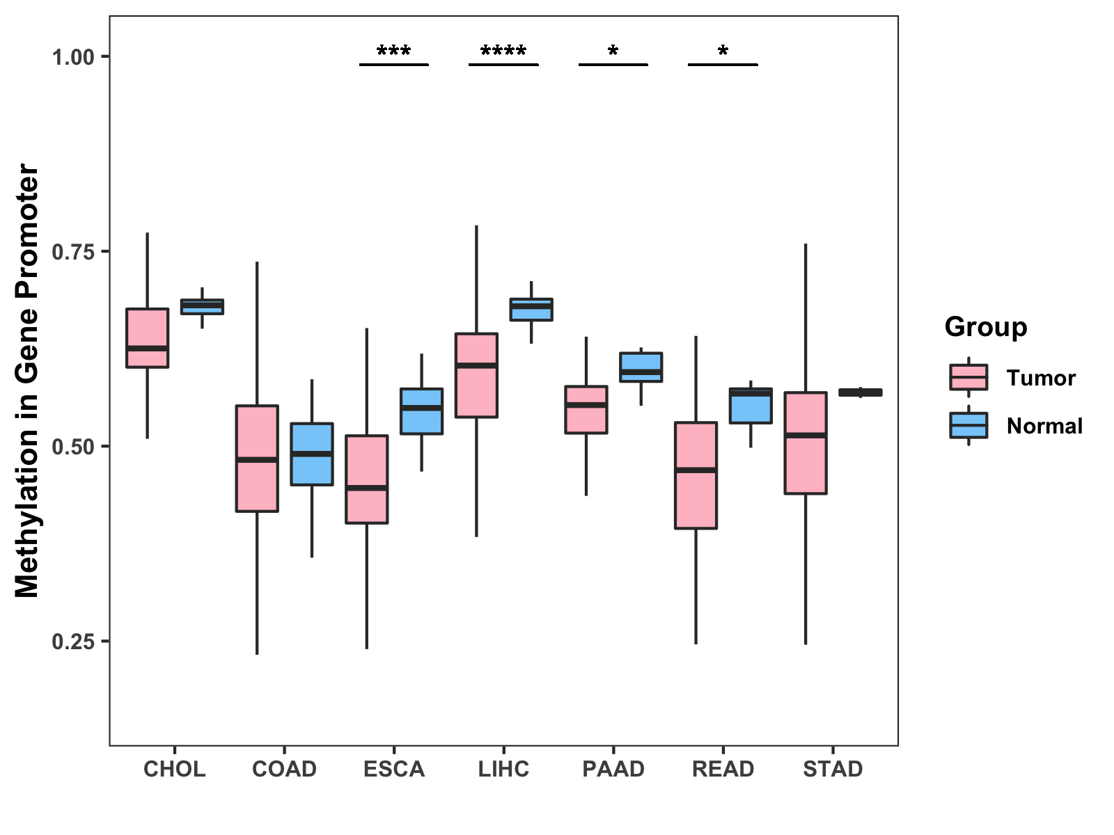 Boxplot of All Gastrointestinal Cancer ( * : 0.01-0.05 , ** : 0.005-0.01 , *** : 0.0001-0.005 , **** : < 0.0001 ) |