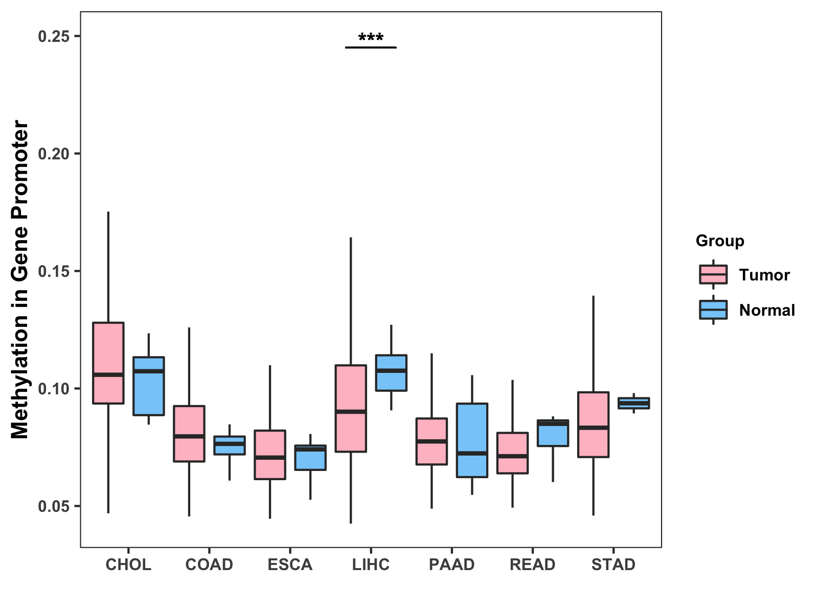 Boxplot of All Gastrointestinal Cancer ( * : 0.01-0.05 , ** : 0.005-0.01 , *** : 0.0001-0.005 , **** : < 0.0001 ) |