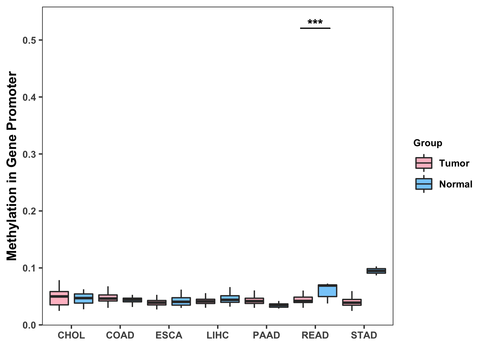 Boxplot of All Gastrointestinal Cancer ( * : 0.01-0.05 , ** : 0.005-0.01 , *** : 0.0001-0.005 , **** : < 0.0001 ) |