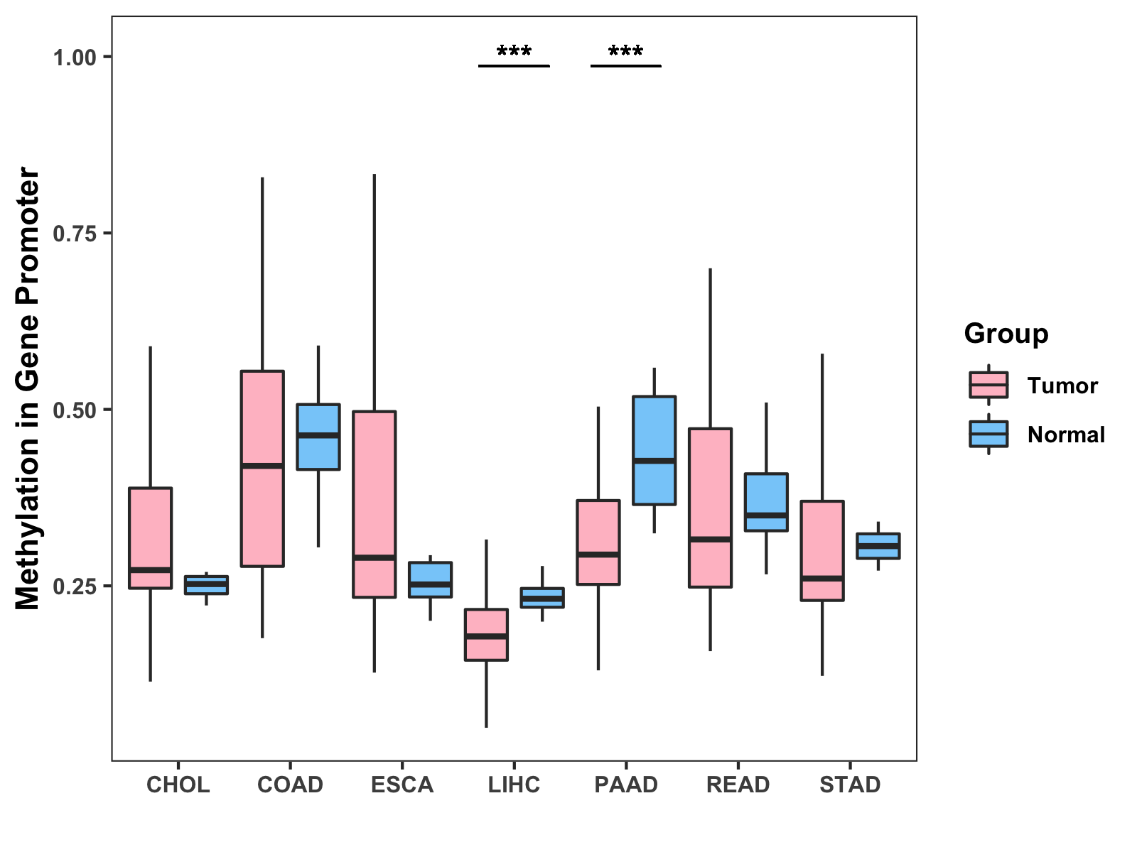 Boxplot of All Gastrointestinal Cancer ( * : 0.01-0.05 , ** : 0.005-0.01 , *** : 0.0001-0.005 , **** : < 0.0001 ) |