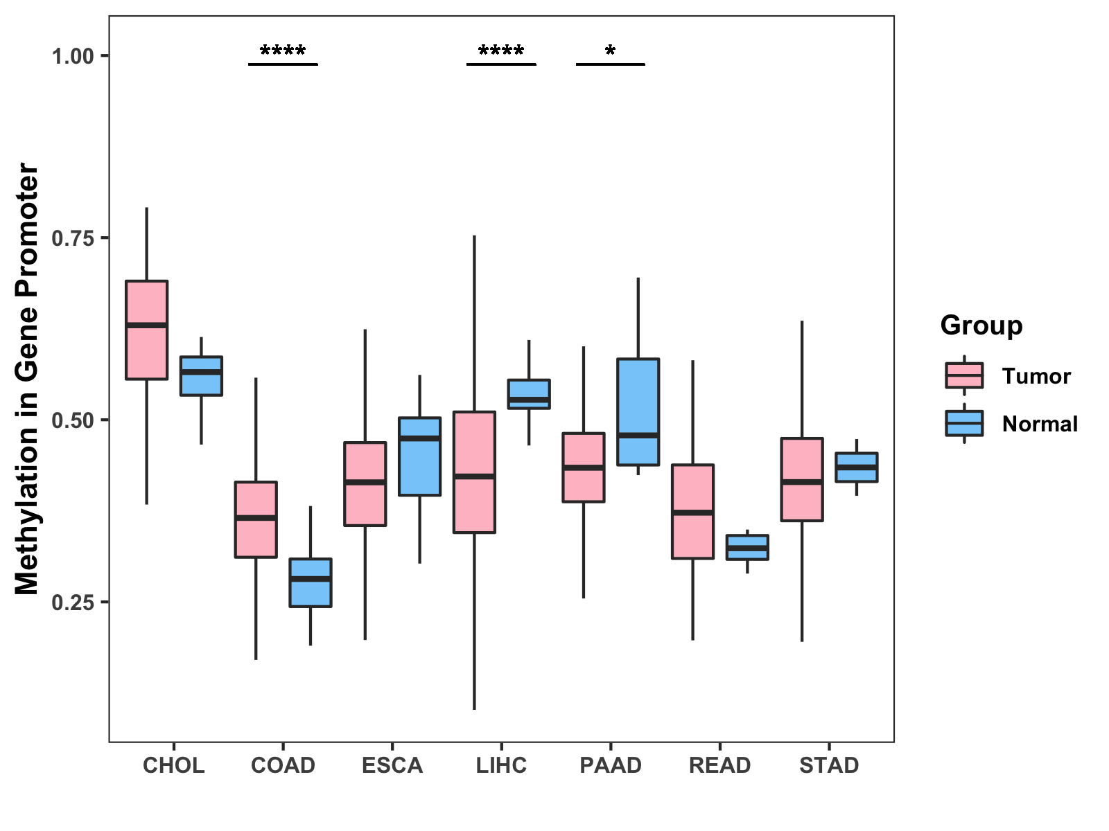 Boxplot of All Gastrointestinal Cancer ( * : 0.01-0.05 , ** : 0.005-0.01 , *** : 0.0001-0.005 , **** : < 0.0001 ) |