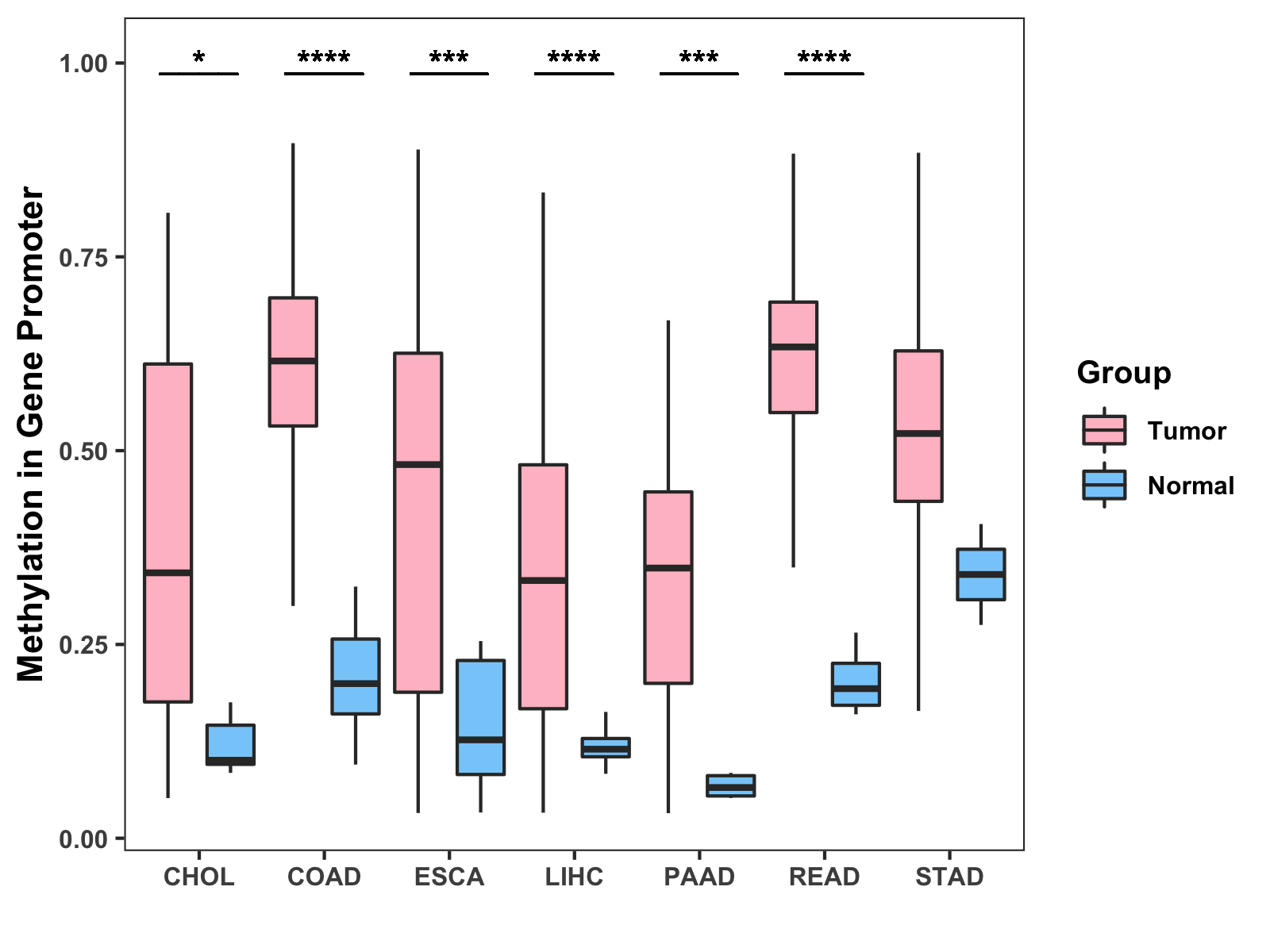 Boxplot of All Gastrointestinal Cancer ( * : 0.01-0.05 , ** : 0.005-0.01 , *** : 0.0001-0.005 , **** : < 0.0001 ) |