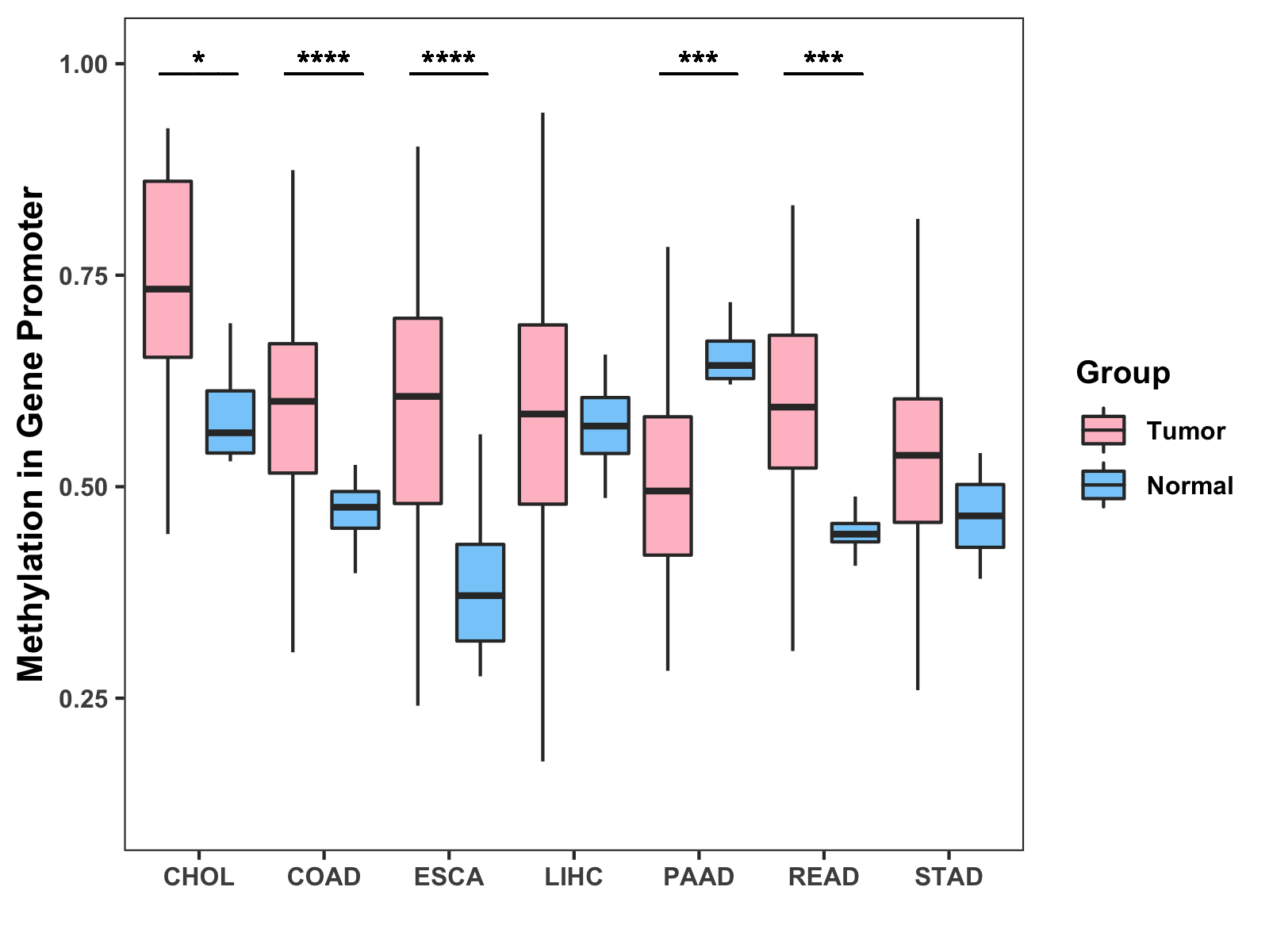 Boxplot of All Gastrointestinal Cancer ( * : 0.01-0.05 , ** : 0.005-0.01 , *** : 0.0001-0.005 , **** : < 0.0001 ) |