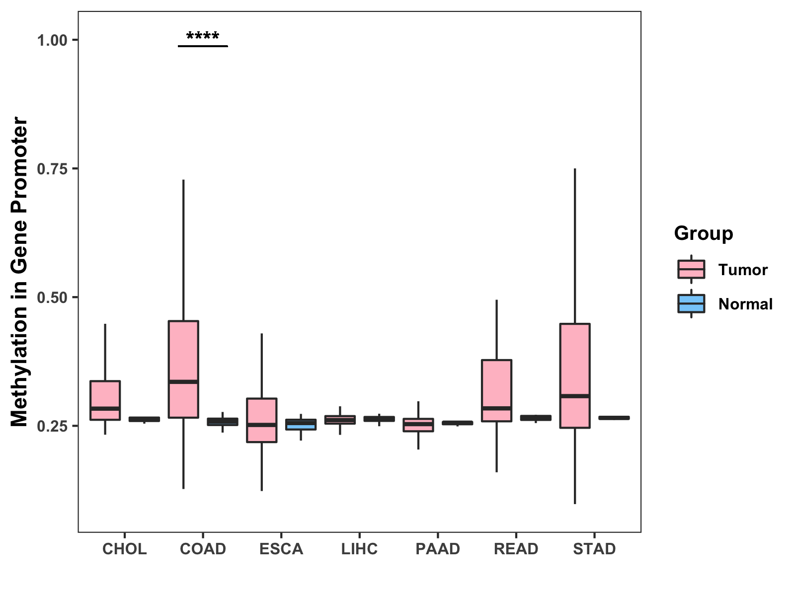 Boxplot of All Gastrointestinal Cancer ( * : 0.01-0.05 , ** : 0.005-0.01 , *** : 0.0001-0.005 , **** : < 0.0001 ) |