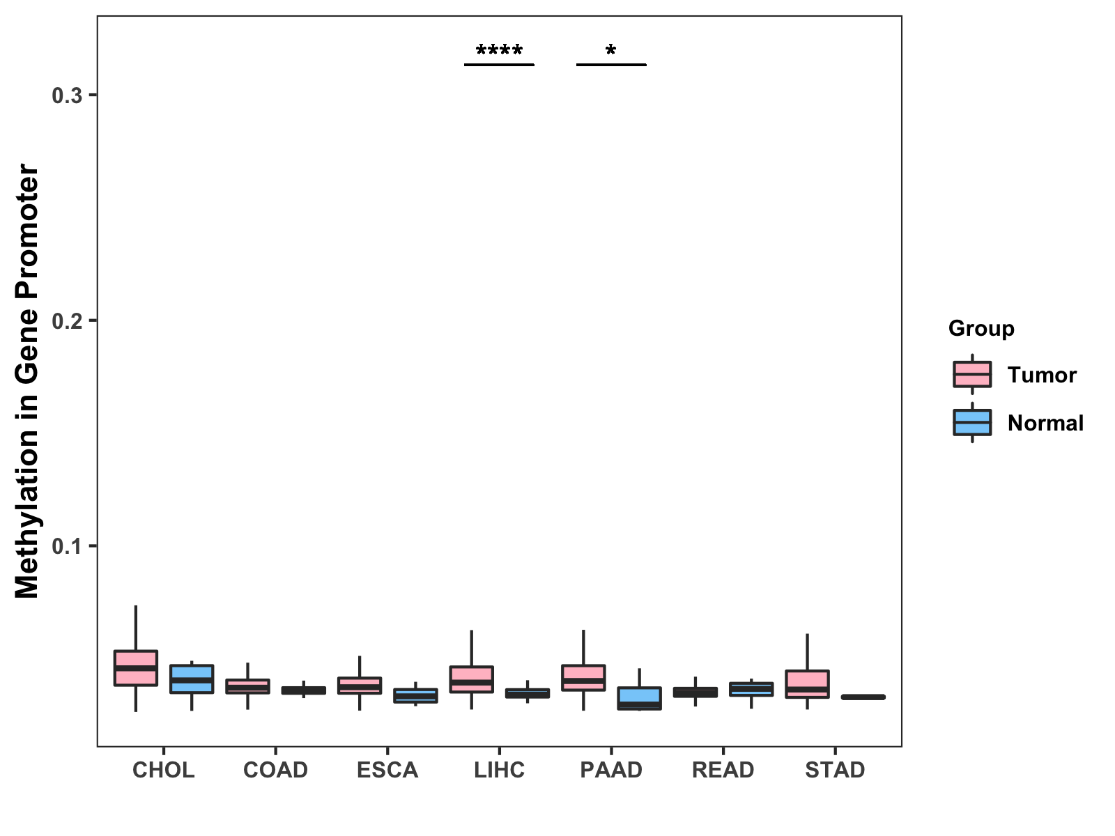 Boxplot of All Gastrointestinal Cancer ( * : 0.01-0.05 , ** : 0.005-0.01 , *** : 0.0001-0.005 , **** : < 0.0001 ) |