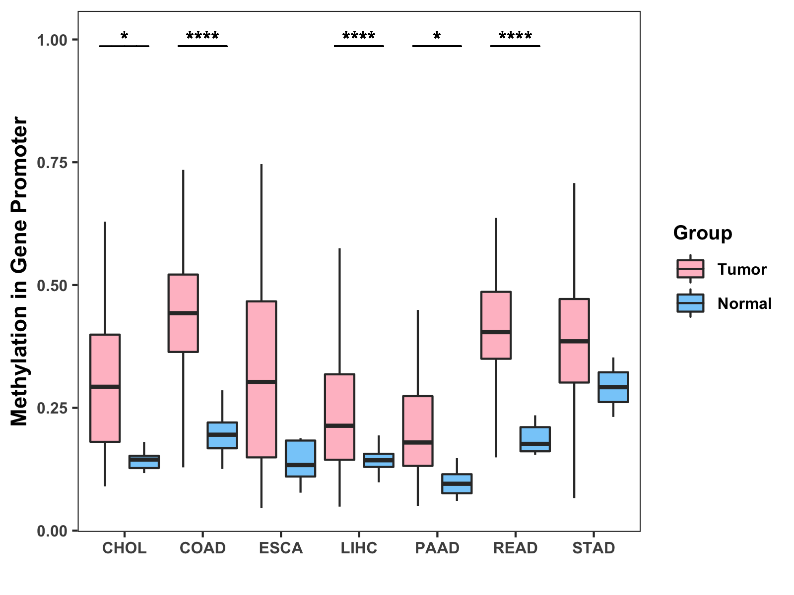 Boxplot of All Gastrointestinal Cancer ( * : 0.01-0.05 , ** : 0.005-0.01 , *** : 0.0001-0.005 , **** : < 0.0001 ) |