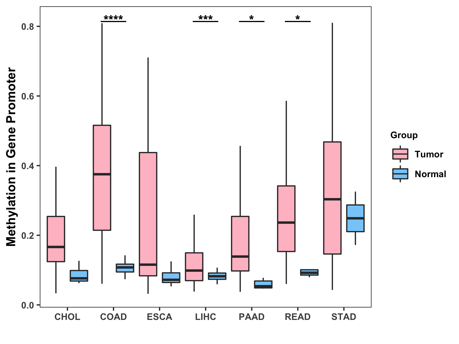 Boxplot of All Gastrointestinal Cancer ( * : 0.01-0.05 , ** : 0.005-0.01 , *** : 0.0001-0.005 , **** : < 0.0001 ) |