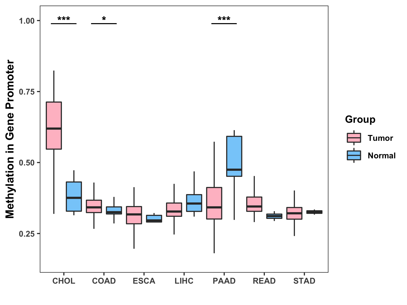 Boxplot of All Gastrointestinal Cancer ( * : 0.01-0.05 , ** : 0.005-0.01 , *** : 0.0001-0.005 , **** : < 0.0001 ) |