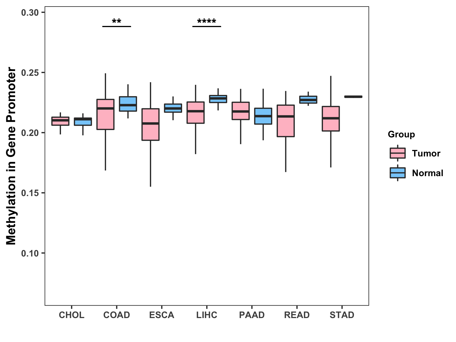 Boxplot of All Gastrointestinal Cancer ( * : 0.01-0.05 , ** : 0.005-0.01 , *** : 0.0001-0.005 , **** : < 0.0001 ) |