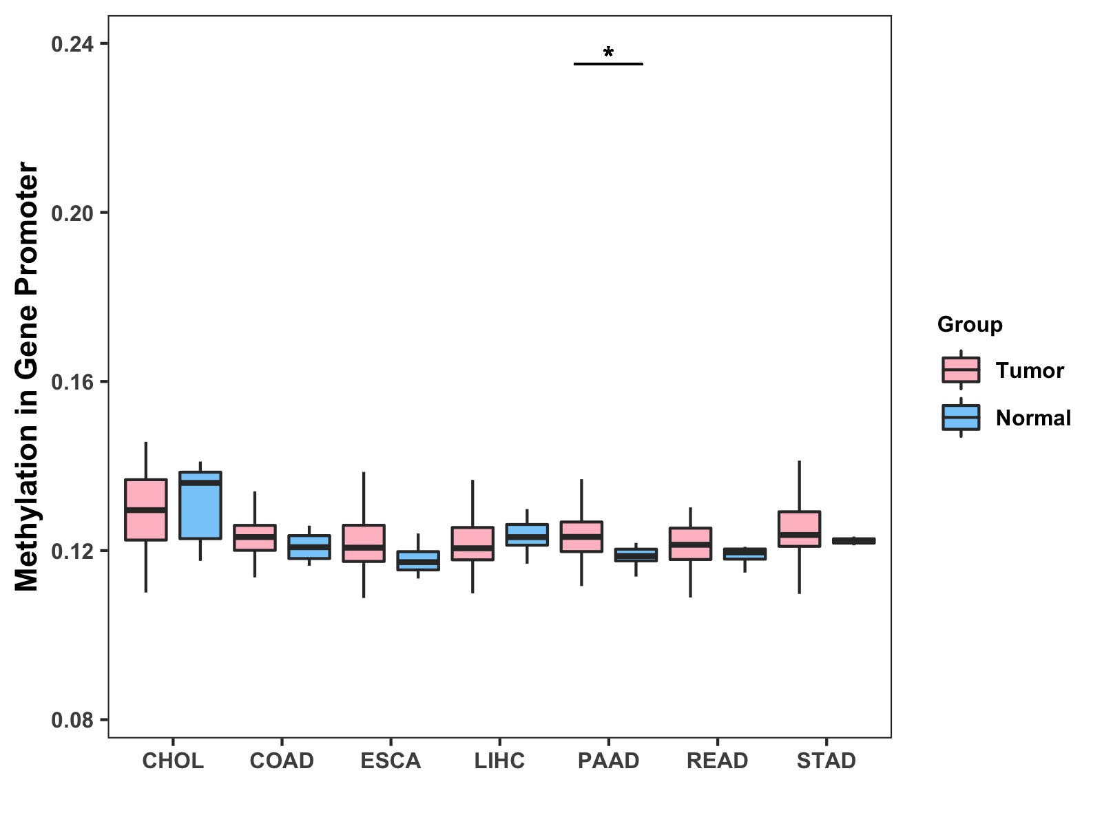 Boxplot of All Gastrointestinal Cancer ( * : 0.01-0.05 , ** : 0.005-0.01 , *** : 0.0001-0.005 , **** : < 0.0001 ) |