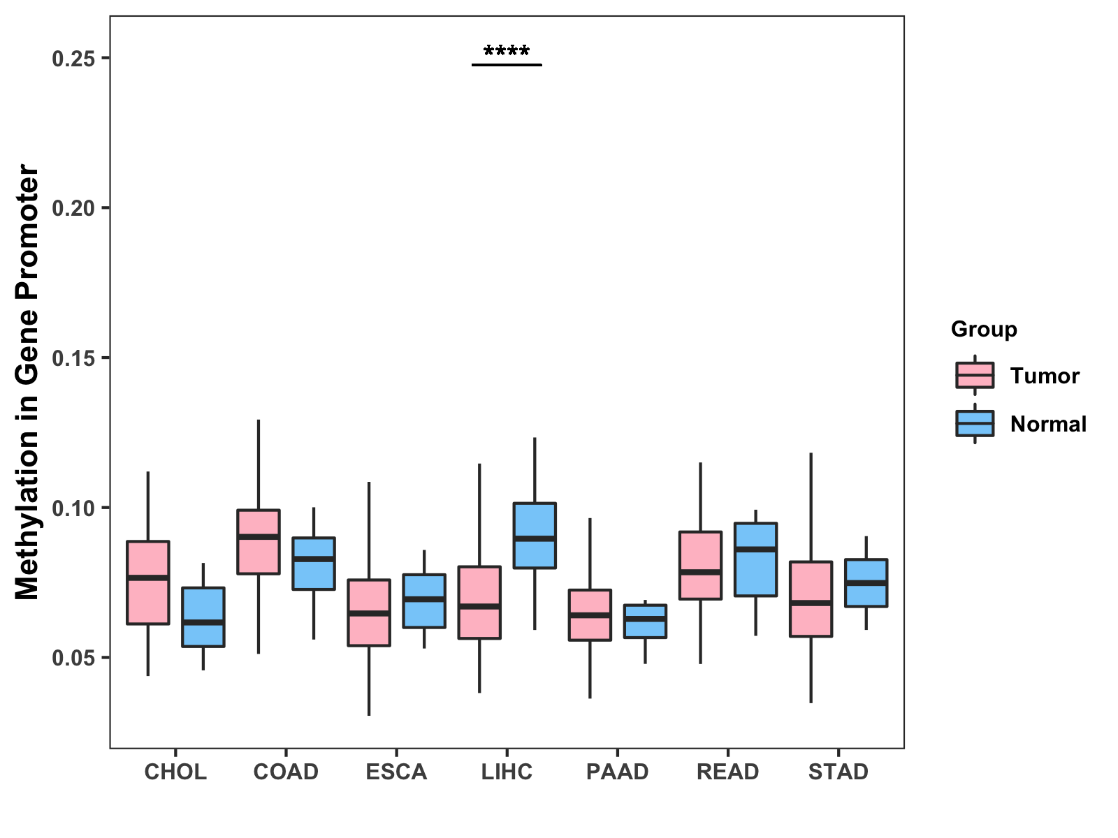 Boxplot of All Gastrointestinal Cancer ( * : 0.01-0.05 , ** : 0.005-0.01 , *** : 0.0001-0.005 , **** : < 0.0001 ) |