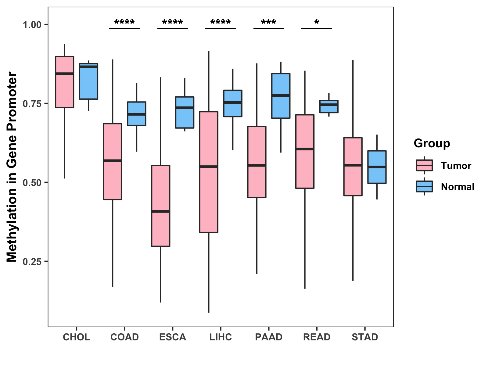 Boxplot of All Gastrointestinal Cancer ( * : 0.01-0.05 , ** : 0.005-0.01 , *** : 0.0001-0.005 , **** : < 0.0001 ) |