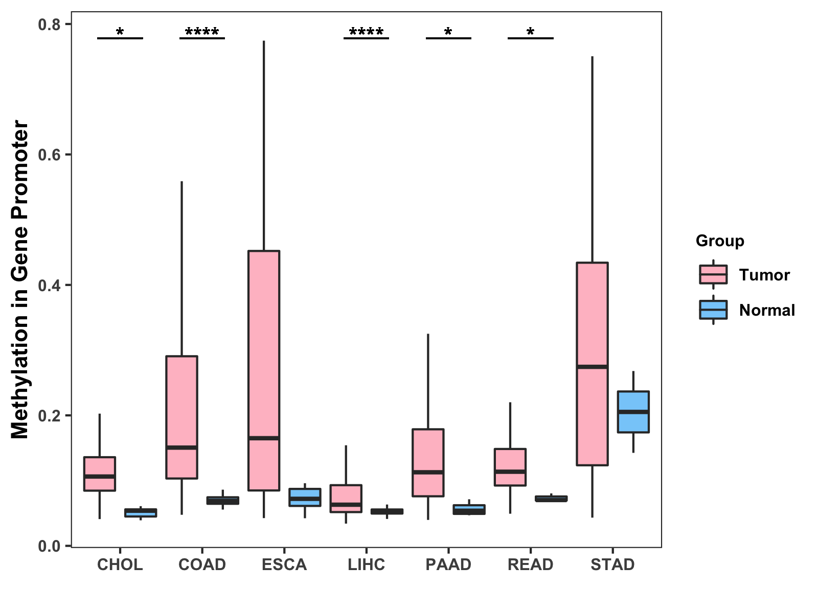 Boxplot of All Gastrointestinal Cancer ( * : 0.01-0.05 , ** : 0.005-0.01 , *** : 0.0001-0.005 , **** : < 0.0001 ) |