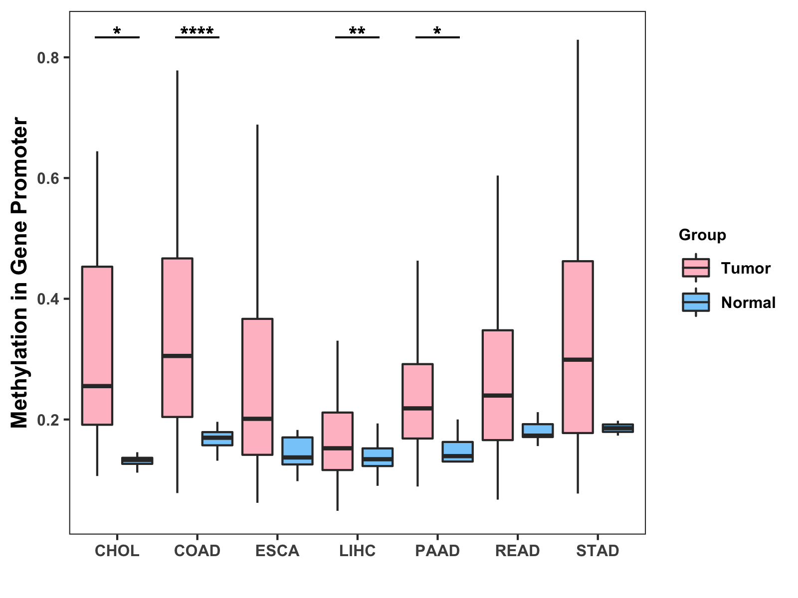 Boxplot of All Gastrointestinal Cancer ( * : 0.01-0.05 , ** : 0.005-0.01 , *** : 0.0001-0.005 , **** : < 0.0001 ) |