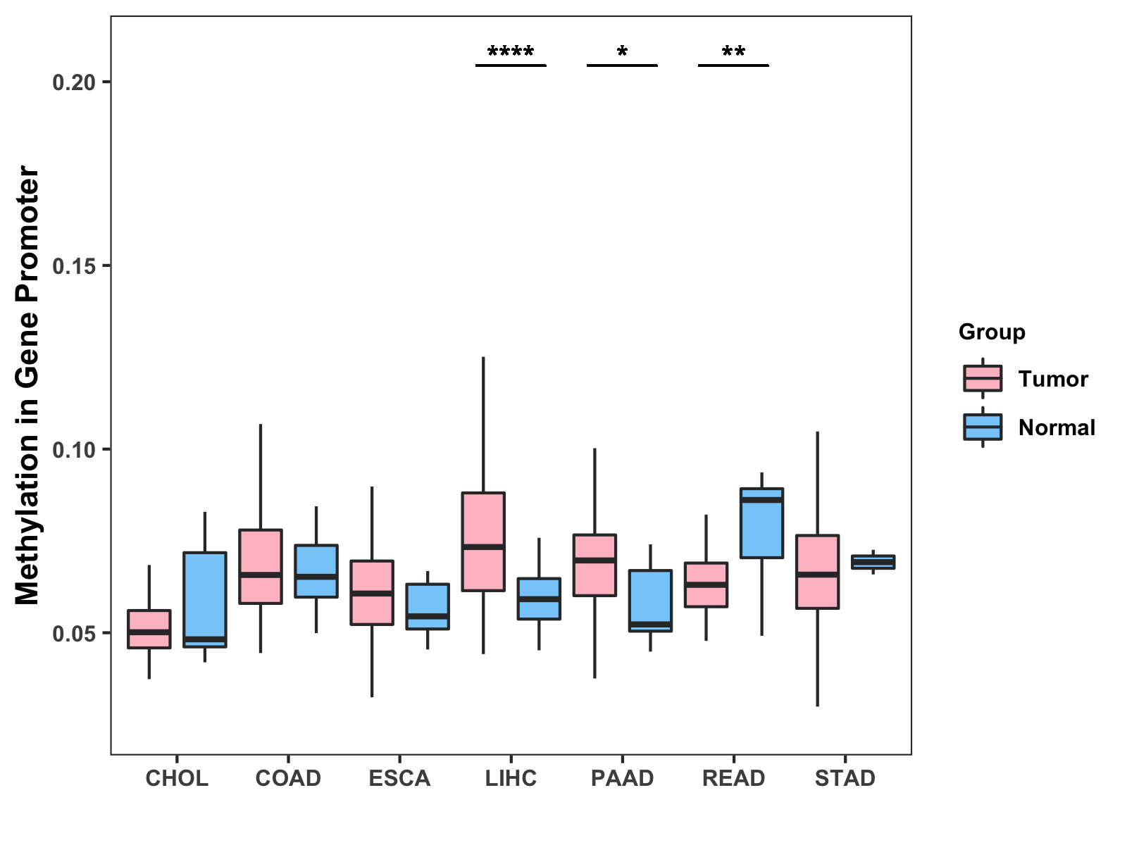 Boxplot of All Gastrointestinal Cancer ( * : 0.01-0.05 , ** : 0.005-0.01 , *** : 0.0001-0.005 , **** : < 0.0001 ) |