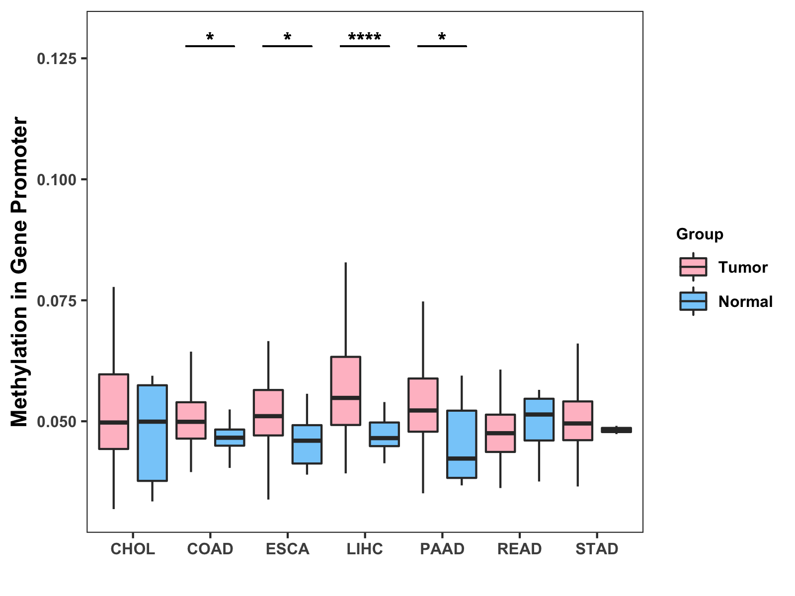 Boxplot of All Gastrointestinal Cancer ( * : 0.01-0.05 , ** : 0.005-0.01 , *** : 0.0001-0.005 , **** : < 0.0001 ) |