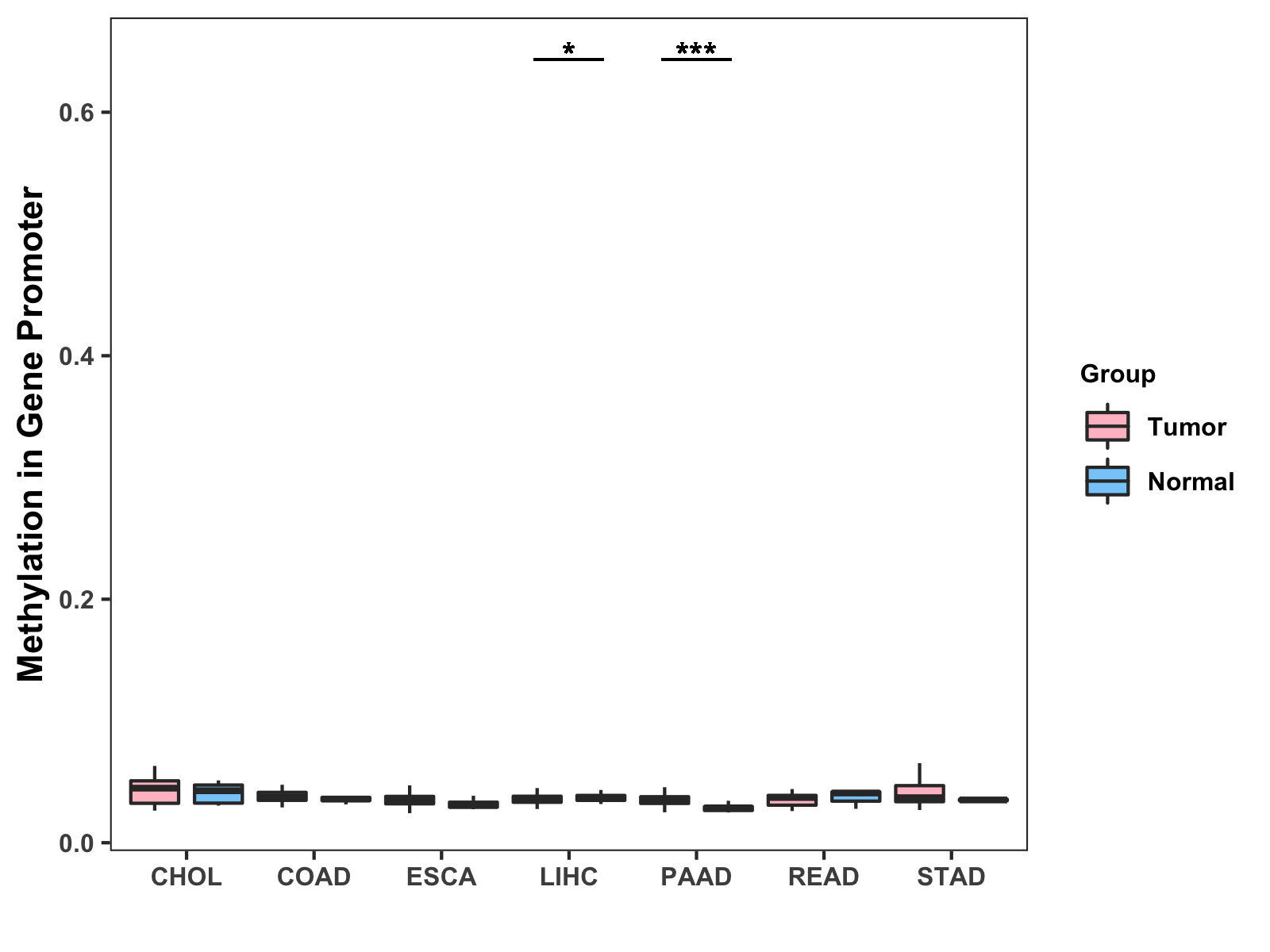 Boxplot of All Gastrointestinal Cancer ( * : 0.01-0.05 , ** : 0.005-0.01 , *** : 0.0001-0.005 , **** : < 0.0001 ) |
