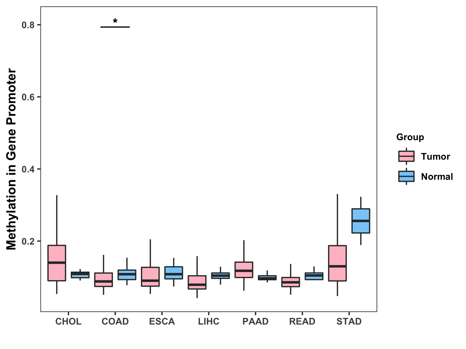 Boxplot of All Gastrointestinal Cancer ( * : 0.01-0.05 , ** : 0.005-0.01 , *** : 0.0001-0.005 , **** : < 0.0001 ) |