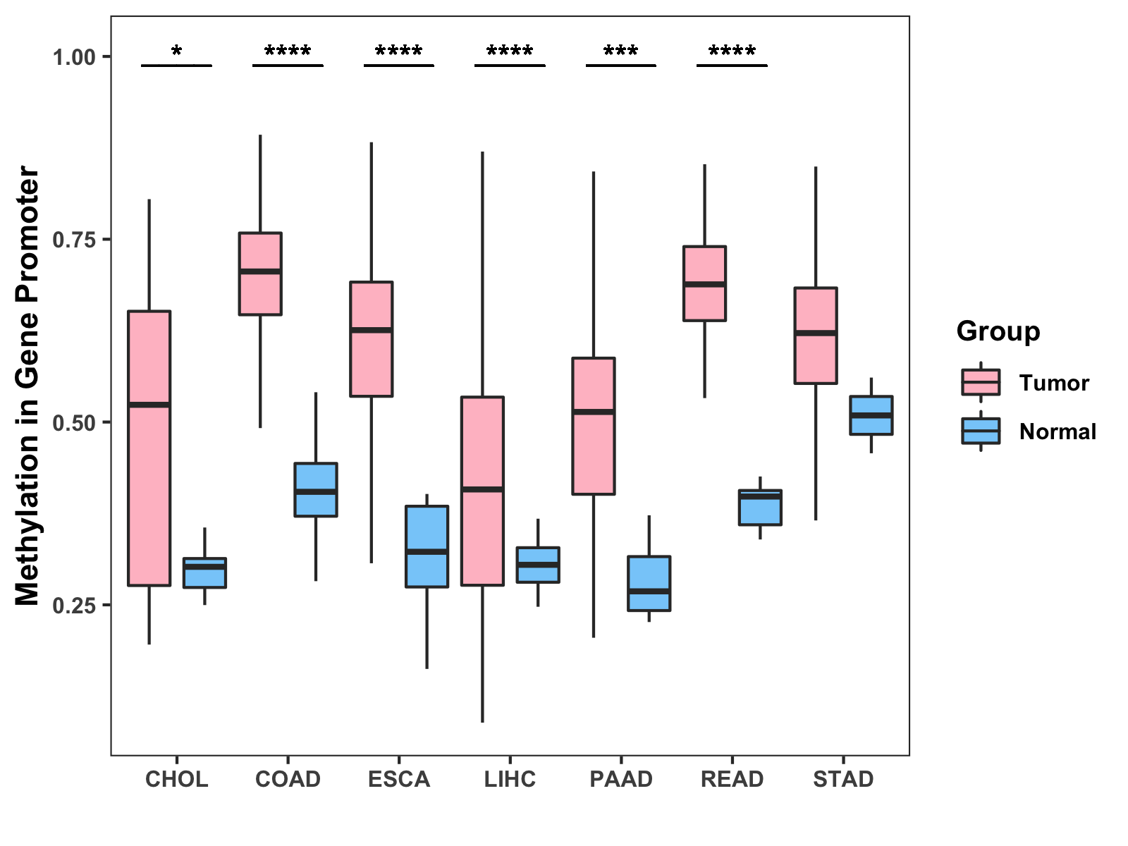 Boxplot of All Gastrointestinal Cancer ( * : 0.01-0.05 , ** : 0.005-0.01 , *** : 0.0001-0.005 , **** : < 0.0001 ) |