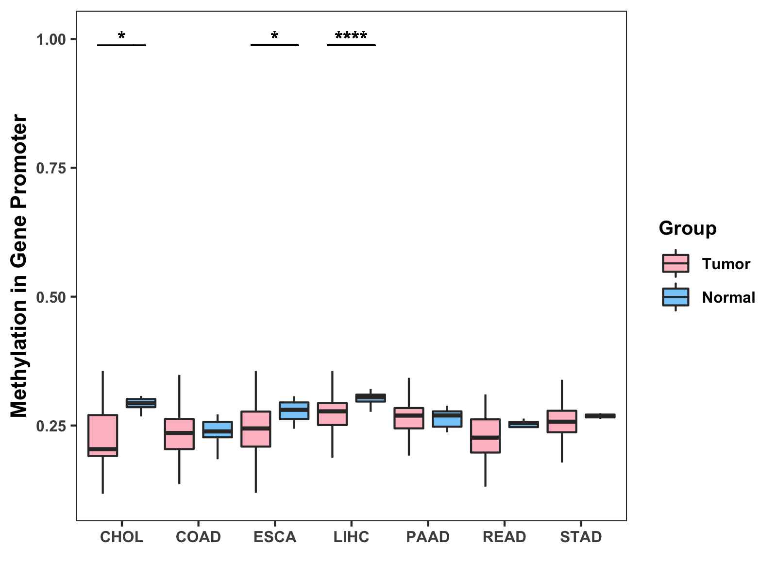 Boxplot of All Gastrointestinal Cancer ( * : 0.01-0.05 , ** : 0.005-0.01 , *** : 0.0001-0.005 , **** : < 0.0001 ) |