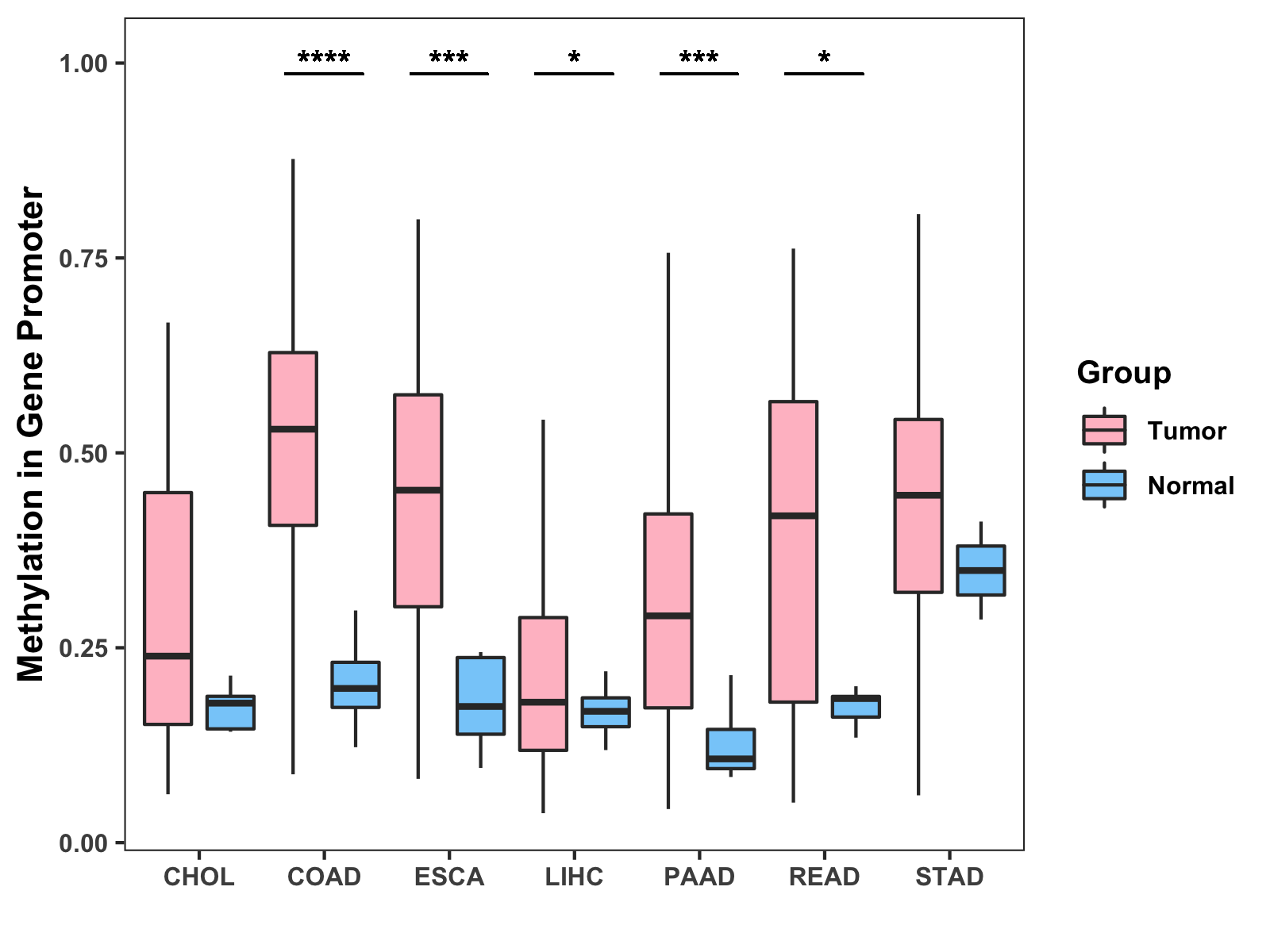 Boxplot of All Gastrointestinal Cancer ( * : 0.01-0.05 , ** : 0.005-0.01 , *** : 0.0001-0.005 , **** : < 0.0001 ) |