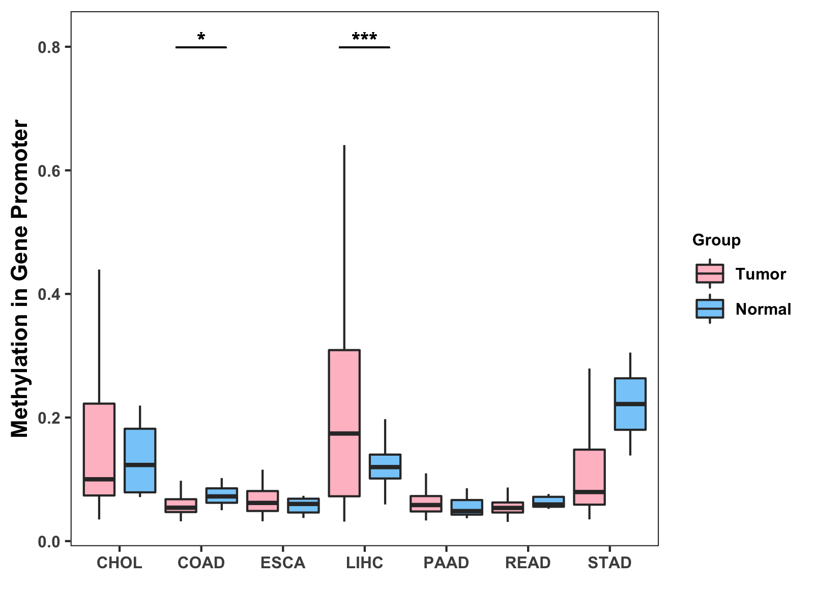 Boxplot of All Gastrointestinal Cancer ( * : 0.01-0.05 , ** : 0.005-0.01 , *** : 0.0001-0.005 , **** : < 0.0001 ) |