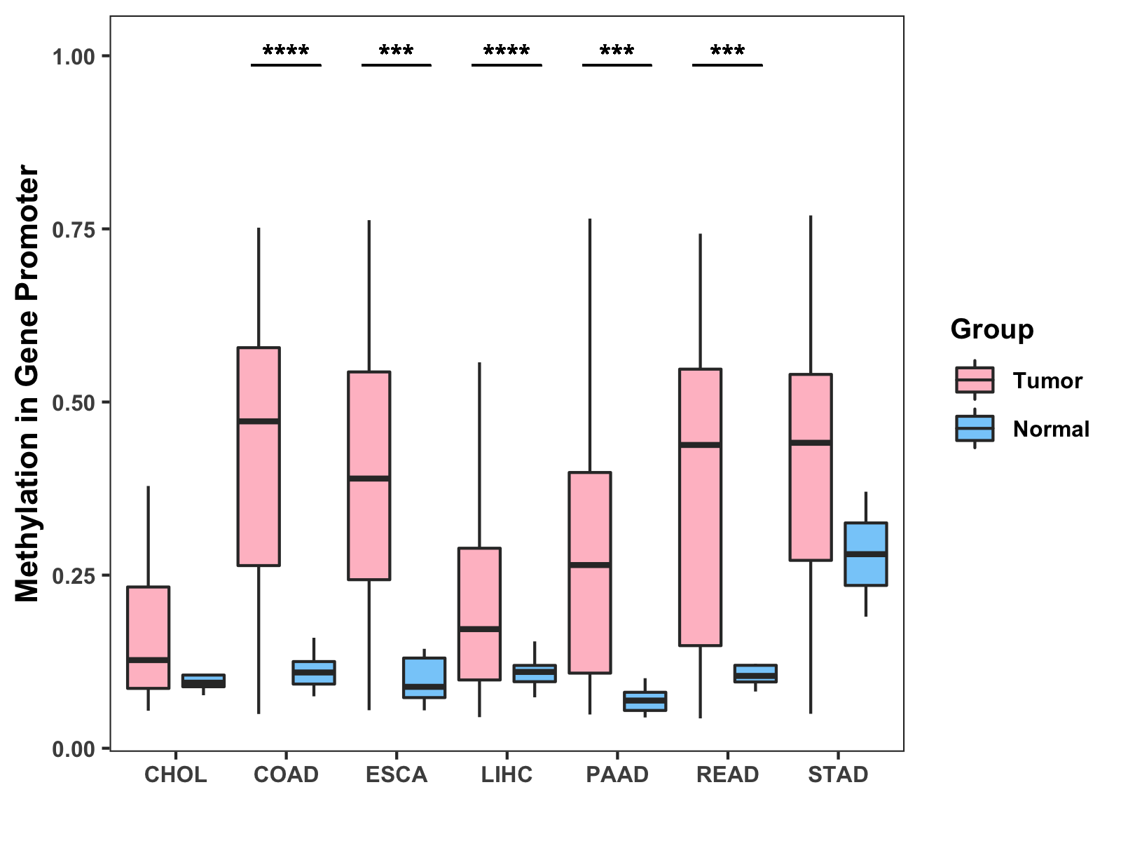 Boxplot of All Gastrointestinal Cancer ( * : 0.01-0.05 , ** : 0.005-0.01 , *** : 0.0001-0.005 , **** : < 0.0001 ) |