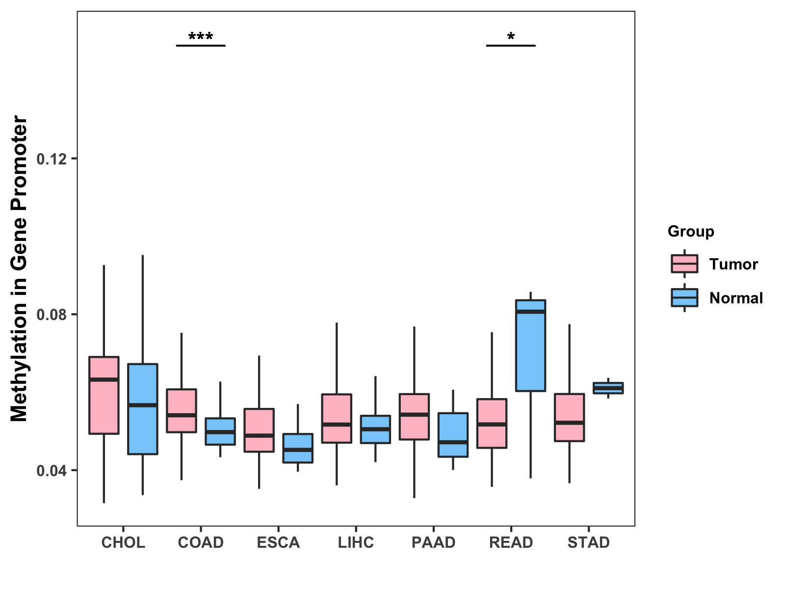 Boxplot of All Gastrointestinal Cancer ( * : 0.01-0.05 , ** : 0.005-0.01 , *** : 0.0001-0.005 , **** : < 0.0001 ) |
