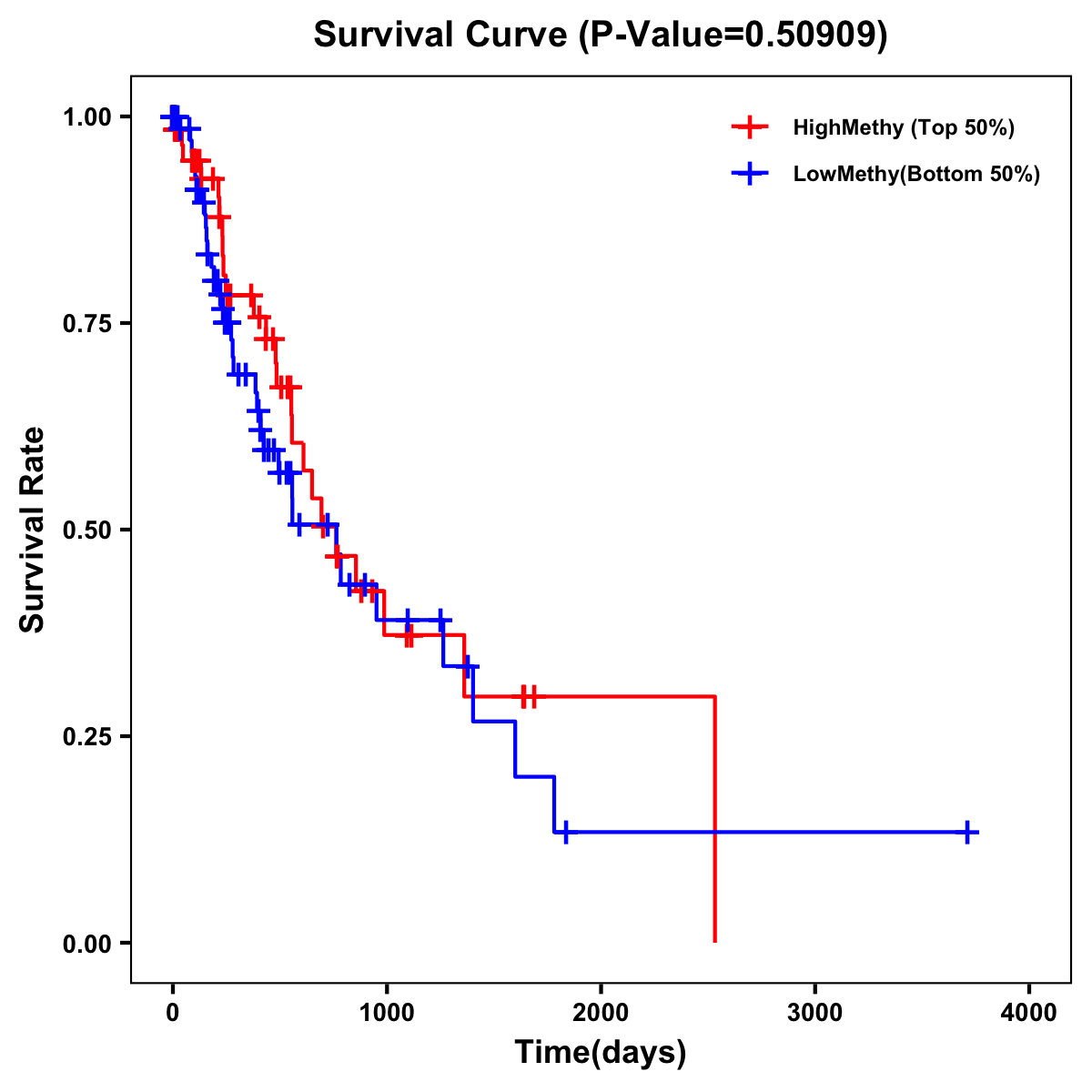 | Survival Curve of Esophagus Cancer of Expression | Survival Curve of Esophagus Cancer of Methylation | ||