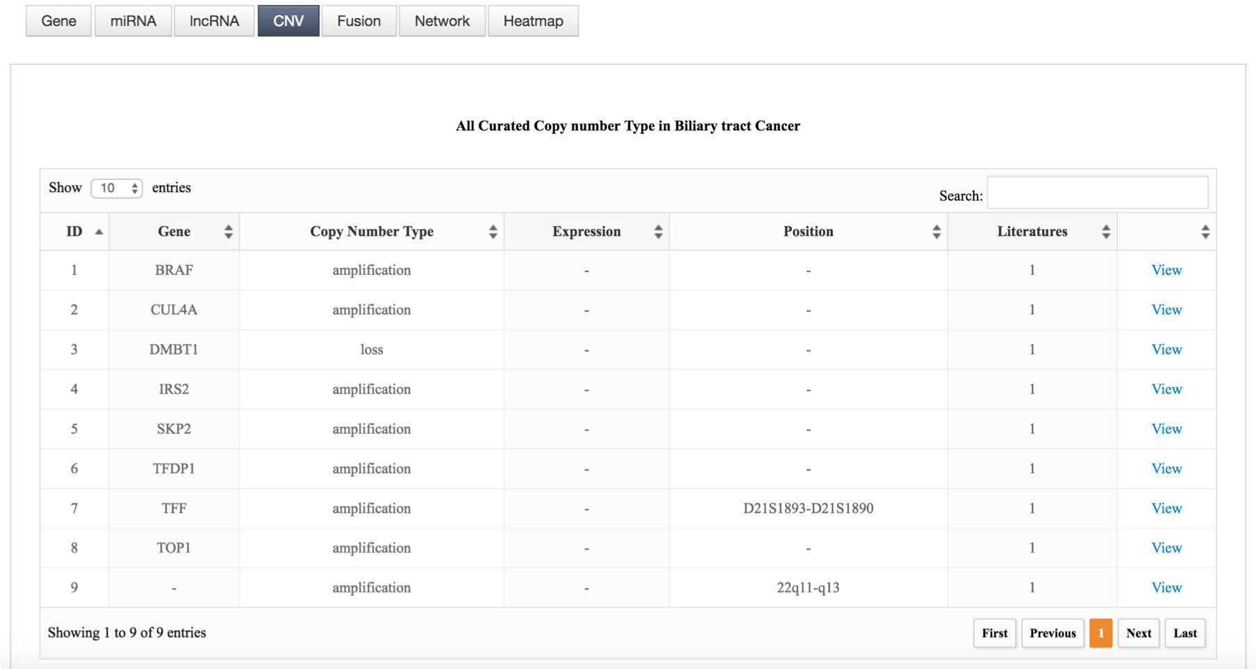 The lists of CNVs have been annotated with gene symbol, copy number type (loss or amplification) , gene expression (underexpression,overexpression, or -), position and literature counts in Pubmed. Click "View" button, the detailed information of these literatures can be displayed.